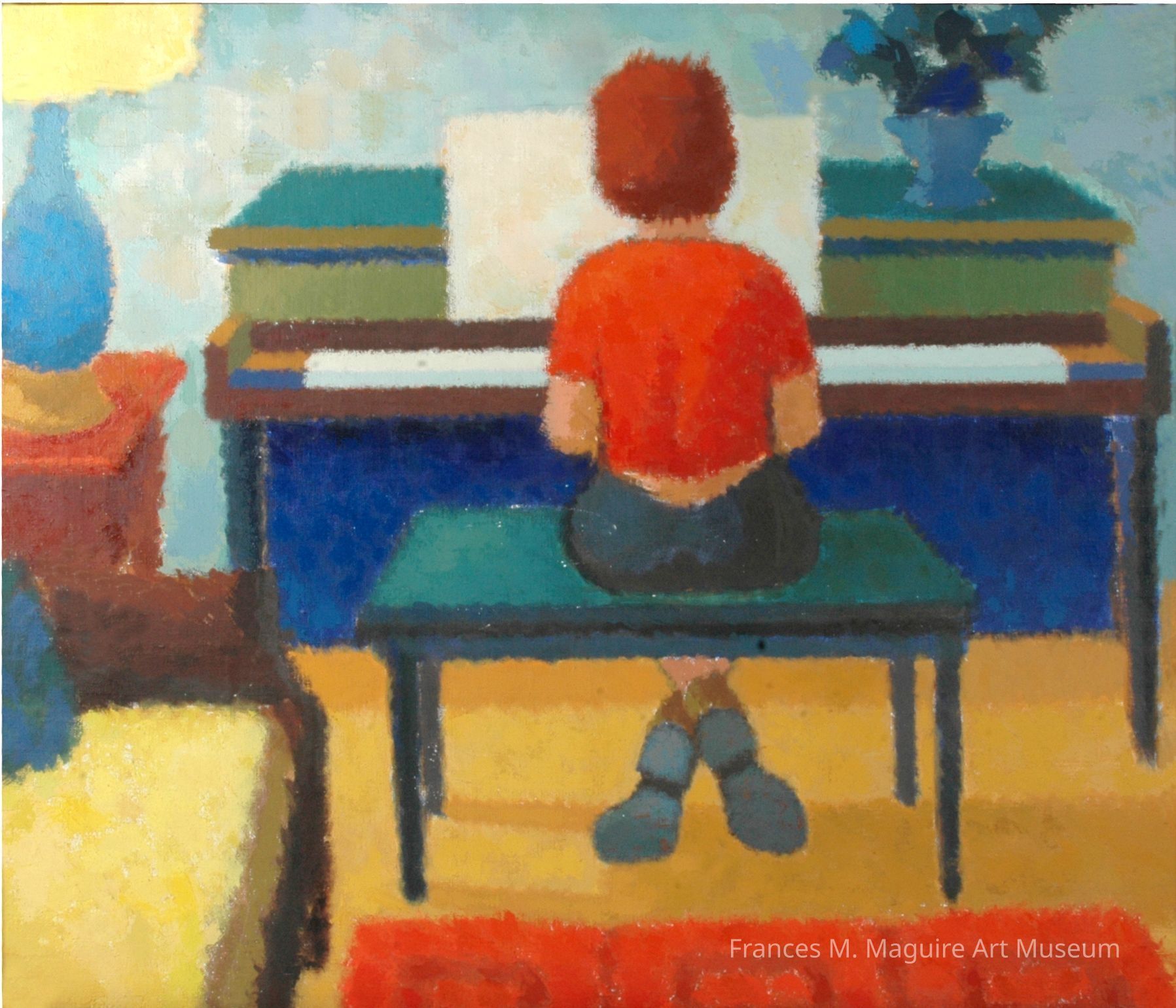 20th-c. oil painting of a girl playing the piano. Another painting is on the front side of this piece.Made/Created