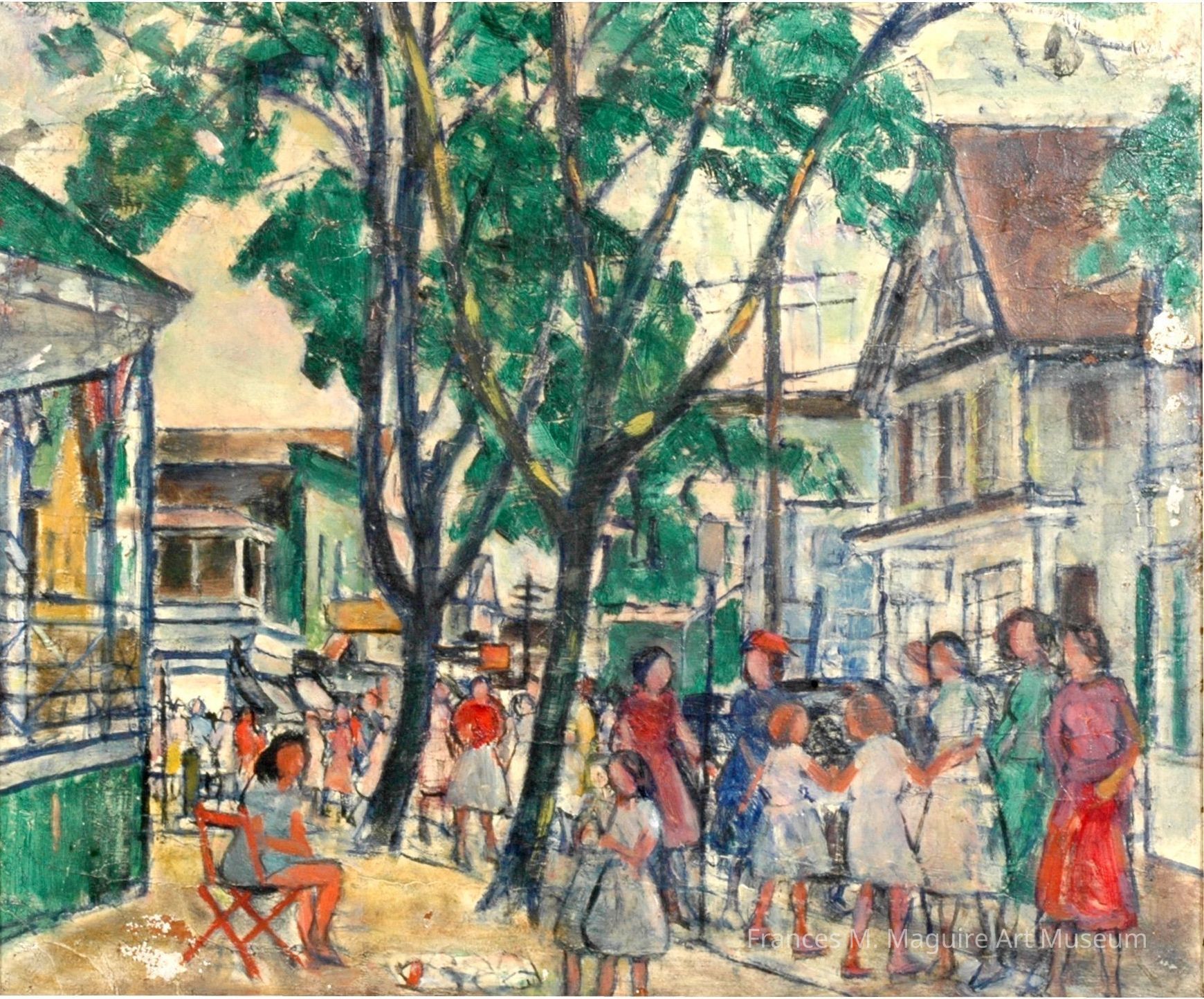 20th-c. oil painting of a girl selling seashells in a bustling town.