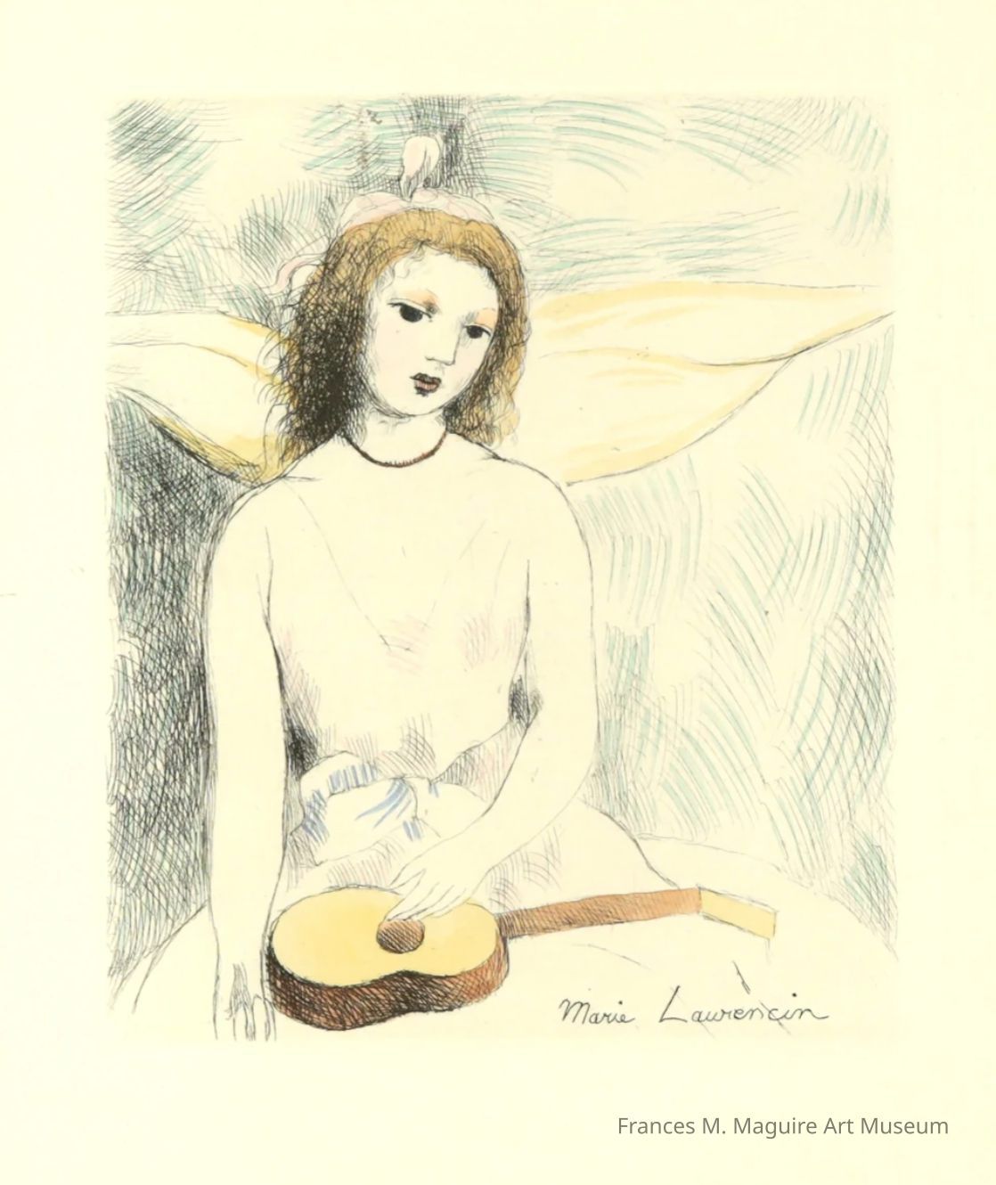 One of her many versions of Girl with a Guitar, Laurencin’s etching showcases her love for representing women in different styles and forms. Laurencin was a 20th-century artist who grew up in Paris, France. In her art, she explored the relationship between sexuality, femininity, and the female figure. This etching is hand-colored, and depicts a woman with wings and a guitar, suggesting the intersectionality between mythological elements, the female form, and music. Her preference to paint and sketch women was revolutionary at the time for a woman artist. She uniquely painted and sketched her version of female beauty. Laurencin also was known for her interest in portraiture and miniature painting traditions, and played a major role in the male-dominated cubist avant-garde. Her works also reflected her interest in Japanese culture and art.