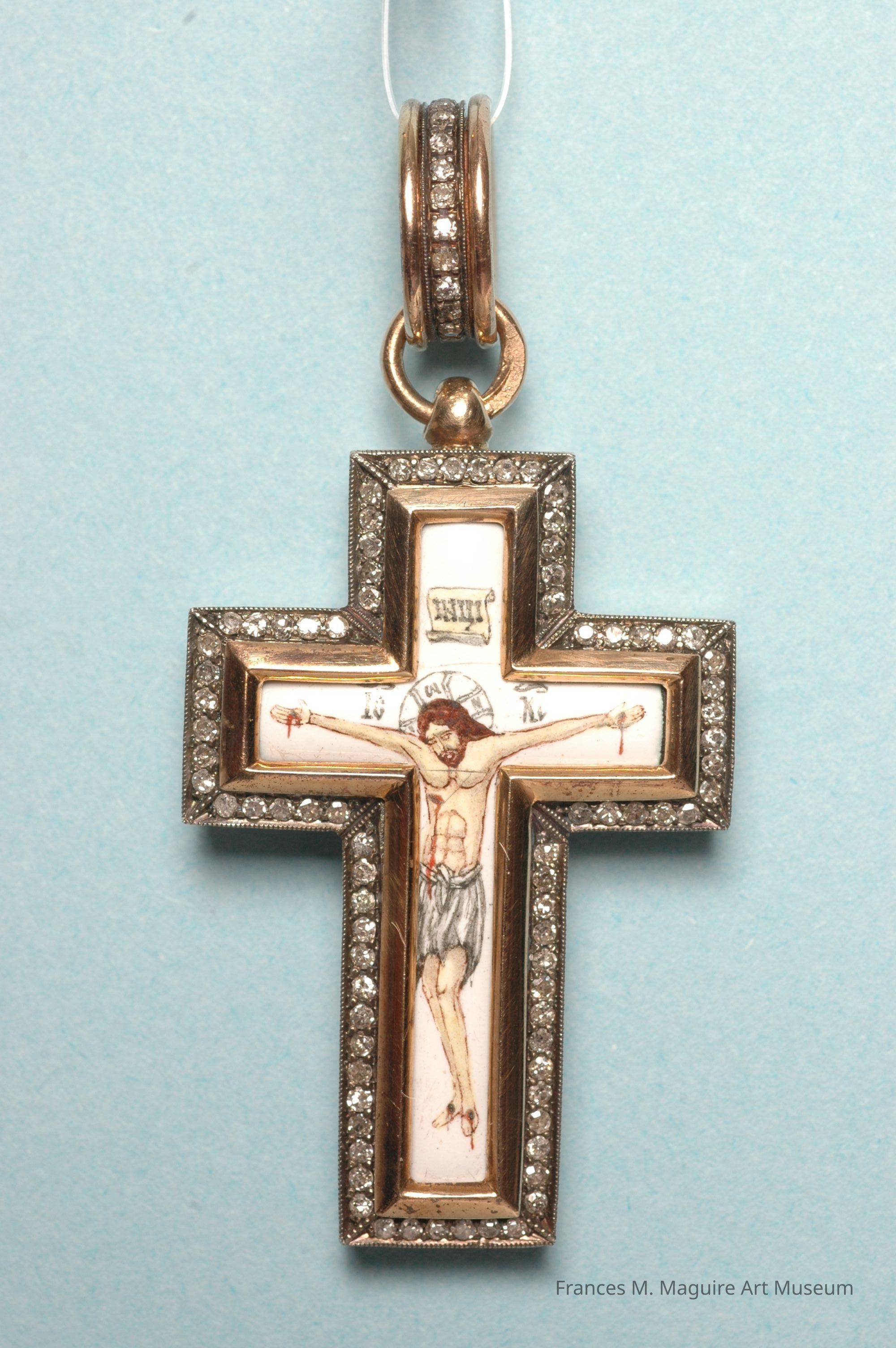 Antique Russian gold and enamel cross pendant with diamond surround depicting Christ on the cross and diamond circle chain end