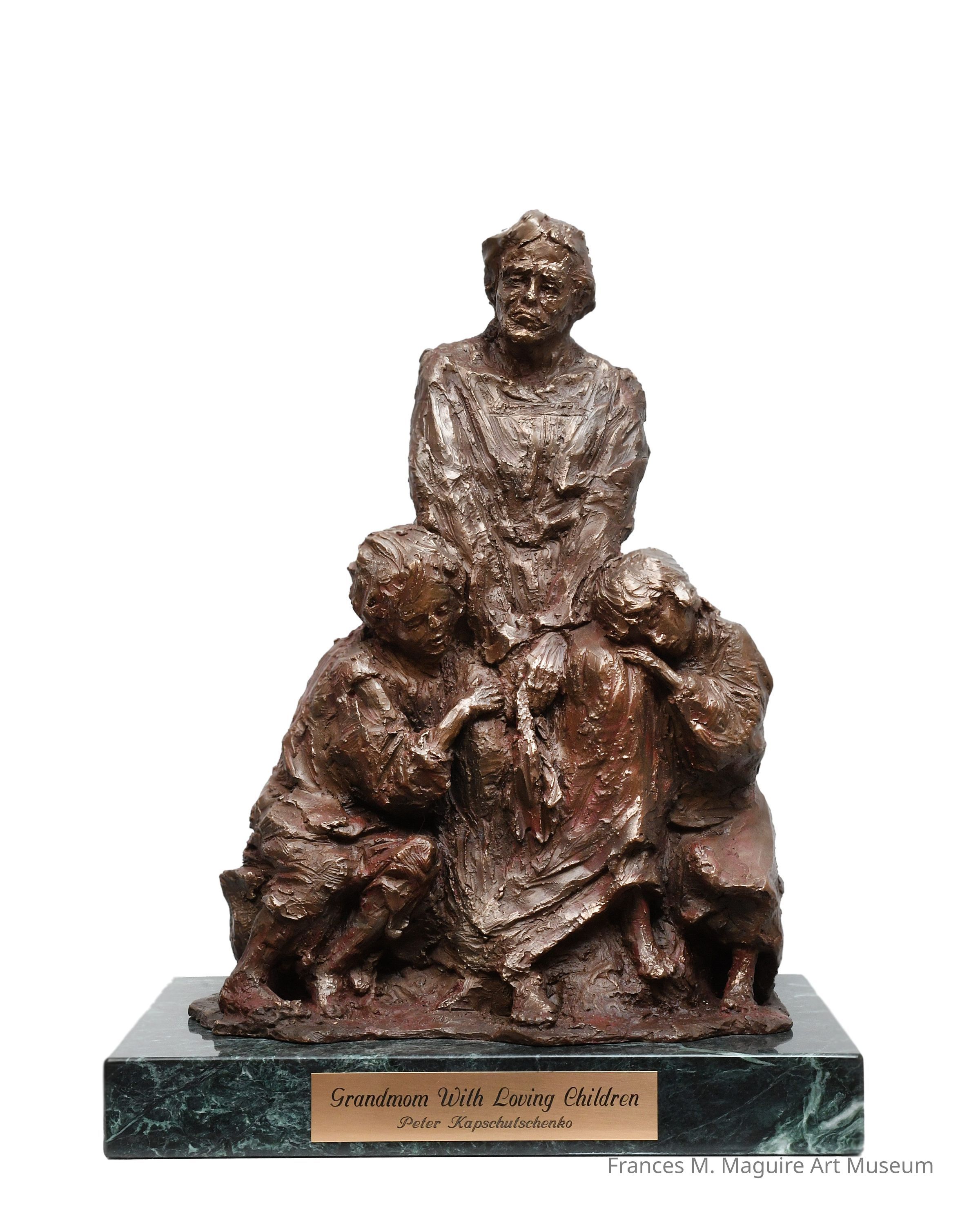 Bronze sculpture of a grandmother surrounded by two children.