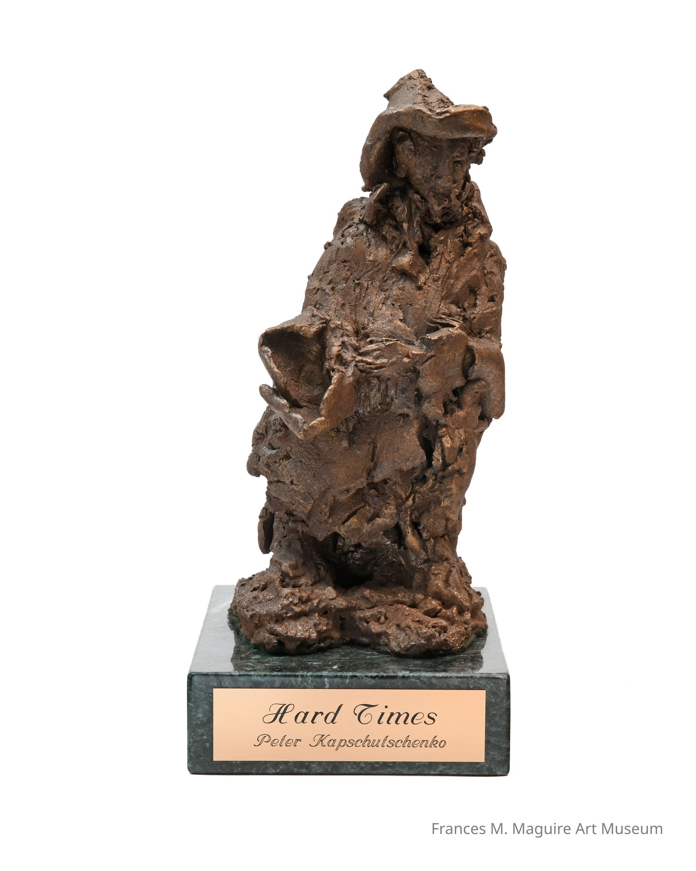 Terracotta sculpture with bronze patina titled "Hard Times" by Peter Kapschutschenko.