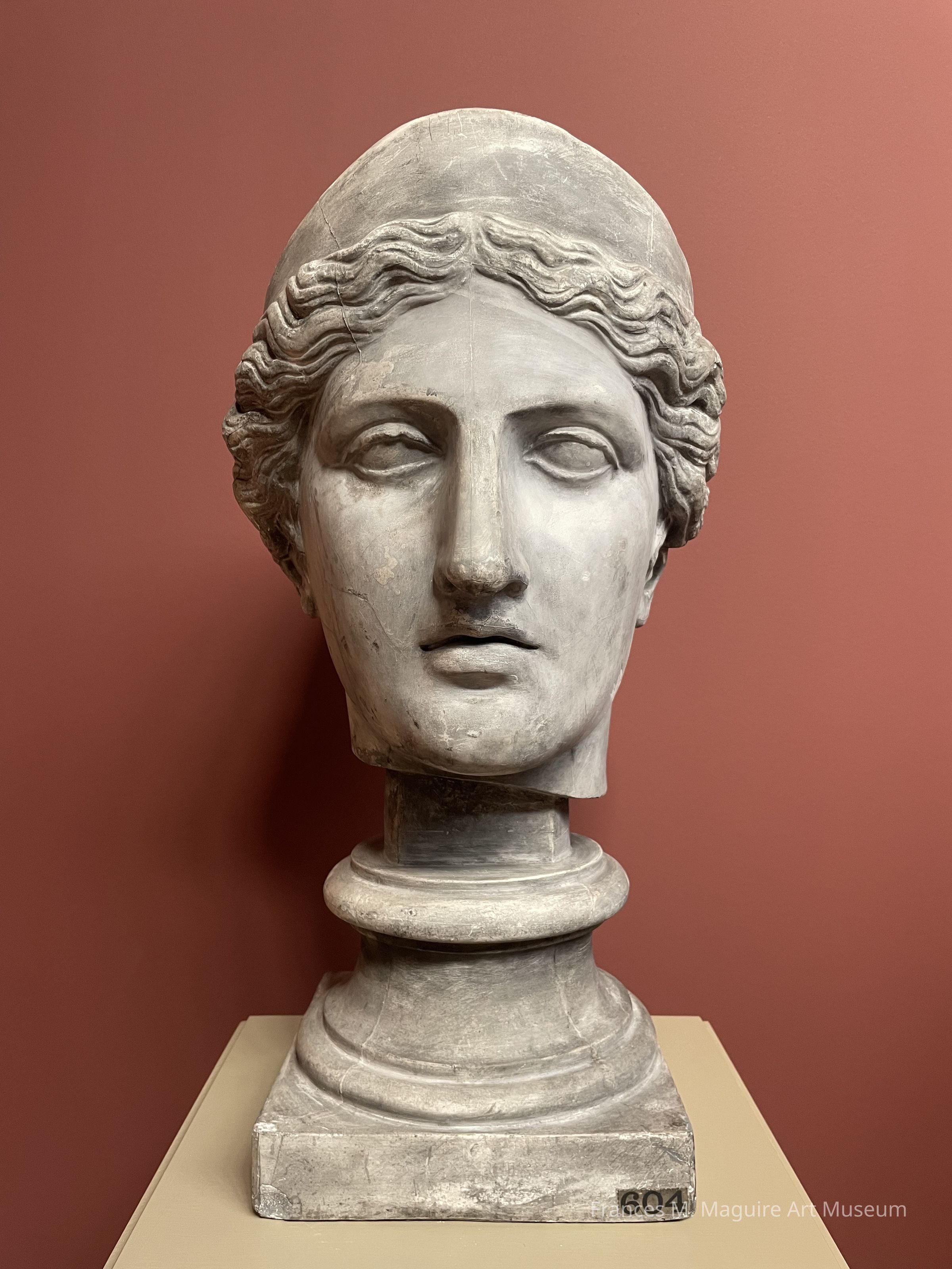 Hera, goddess of marriage and fertility, and consort to Zeus, embodies female strength and power. Her colossal head, large staring eyes, and expressive smile would have struck awe in visitors to Olympia, site of the ancient Olympic Games. Carved in the early 6th century BCE, her facial features emphasize the surface of the stone. Carefully delineated waves of hair frame her forehead beneath her crown. In contrast, softly undulating hair appears in the 5th-century head of the goddess displayed nearby, who wears a diadem rather than a crown. The smile has disappeared, yet even in quiet repose she retains an alert expression and penetrating gaze. In the span of nearly 150 years, Greek sculptors achieved a remarkable ability to portray the human head naturalistically.