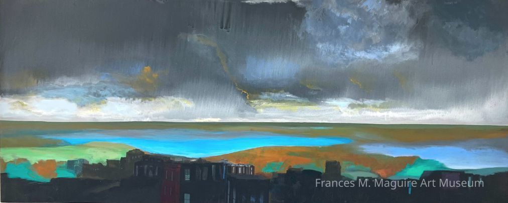 Landscape painting depicting a cloudy sky with heavy rains over an urban setting.Artwork Details