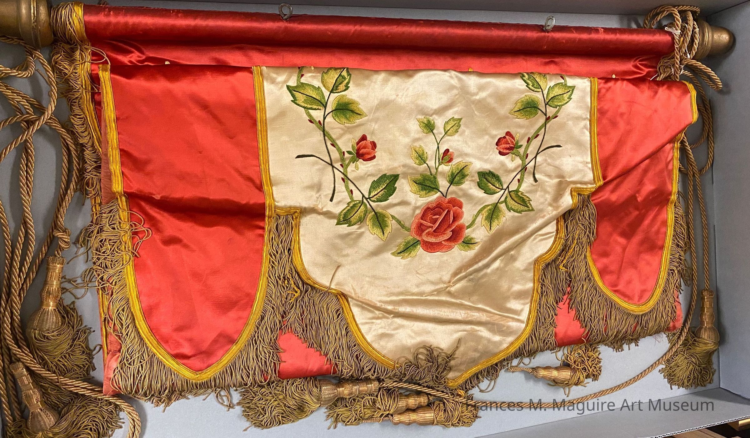 Red and gold satin banner with “Gesu” and two decorative flourishes embroidered in gold on the top valance. “Holy Name Society” is embroidered in gold in an arc above a painted image of a youthful Jesus on canvas, sewn onto the gold satin and enclosed in gold braiding at the center. Roses and leaves are embroidered in color below the image of Jesus. Gold fringe and elaborate gold tassels trim the valance and the sculpted bottom of the banner.Made/Created