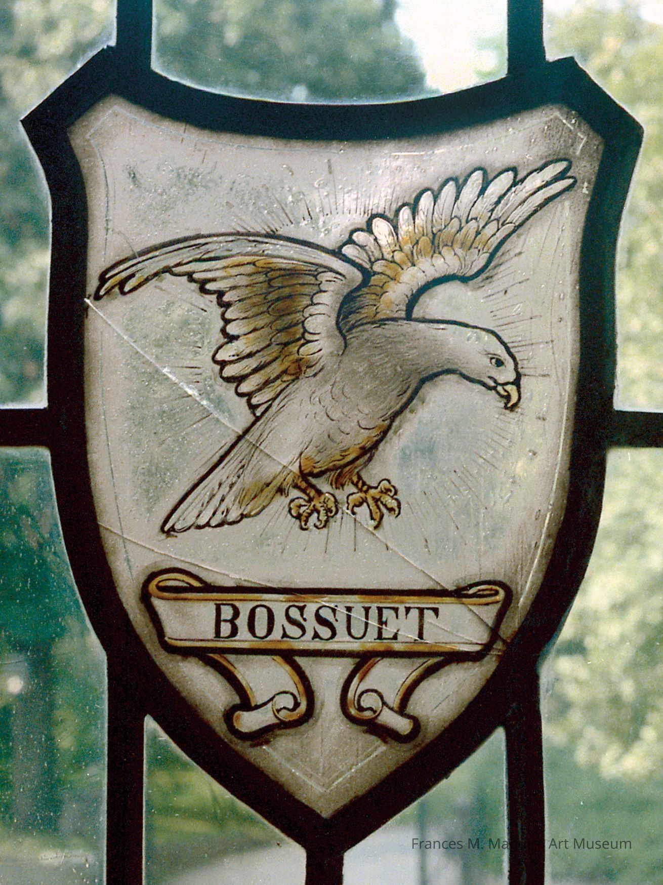 Stained-glass shield commemorating Jacques-Benigne Bossuet (1627-1704), a French Bishop and orator for the French church against papal authority: “The voice of France in the Age of Louis XIV.”Made/Created