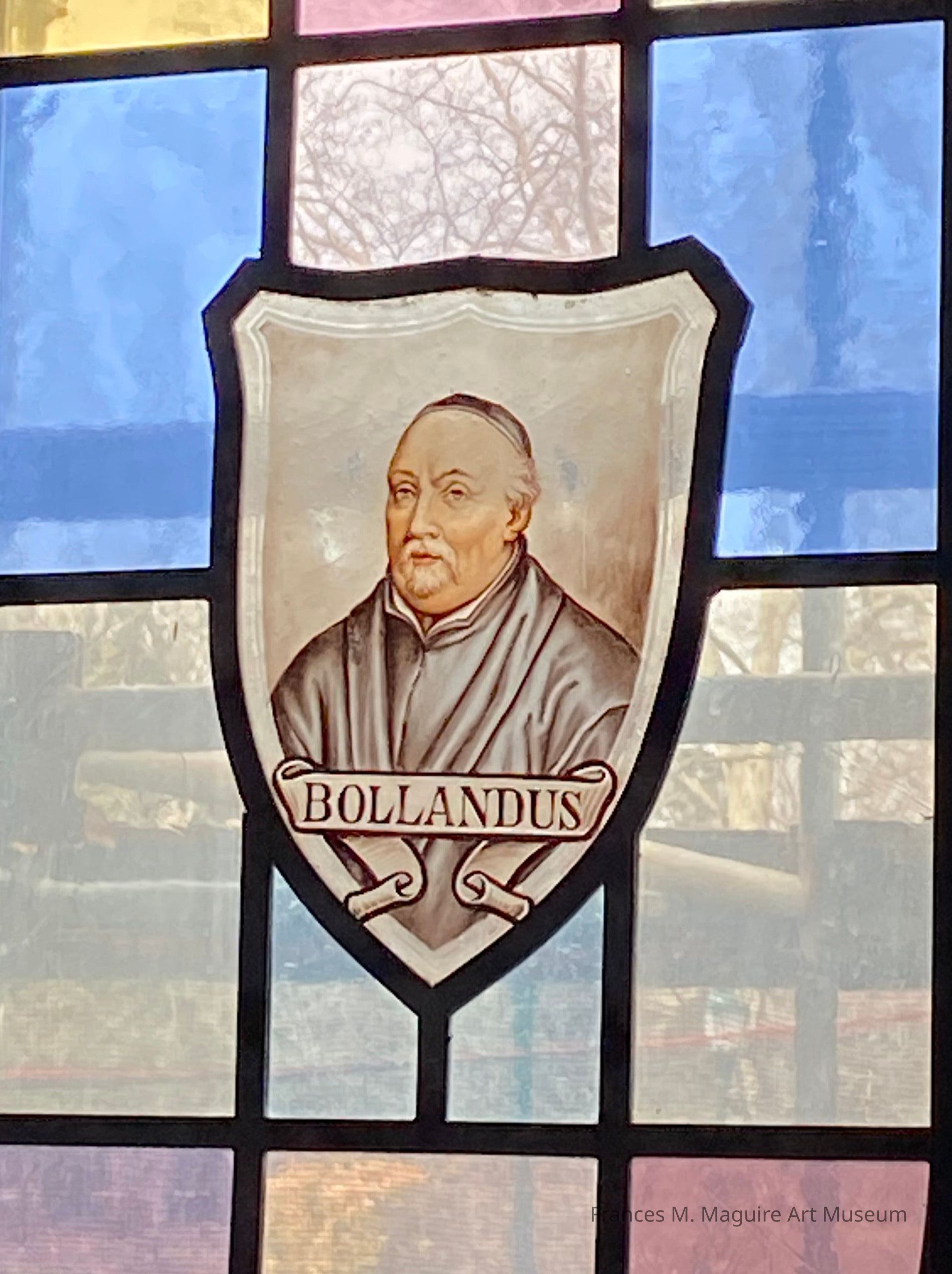 Stained-glass shield commemorating Jean Bolland (1596-1665), a Flemish Jesuit and founder of hagiographical studies.Made/Created