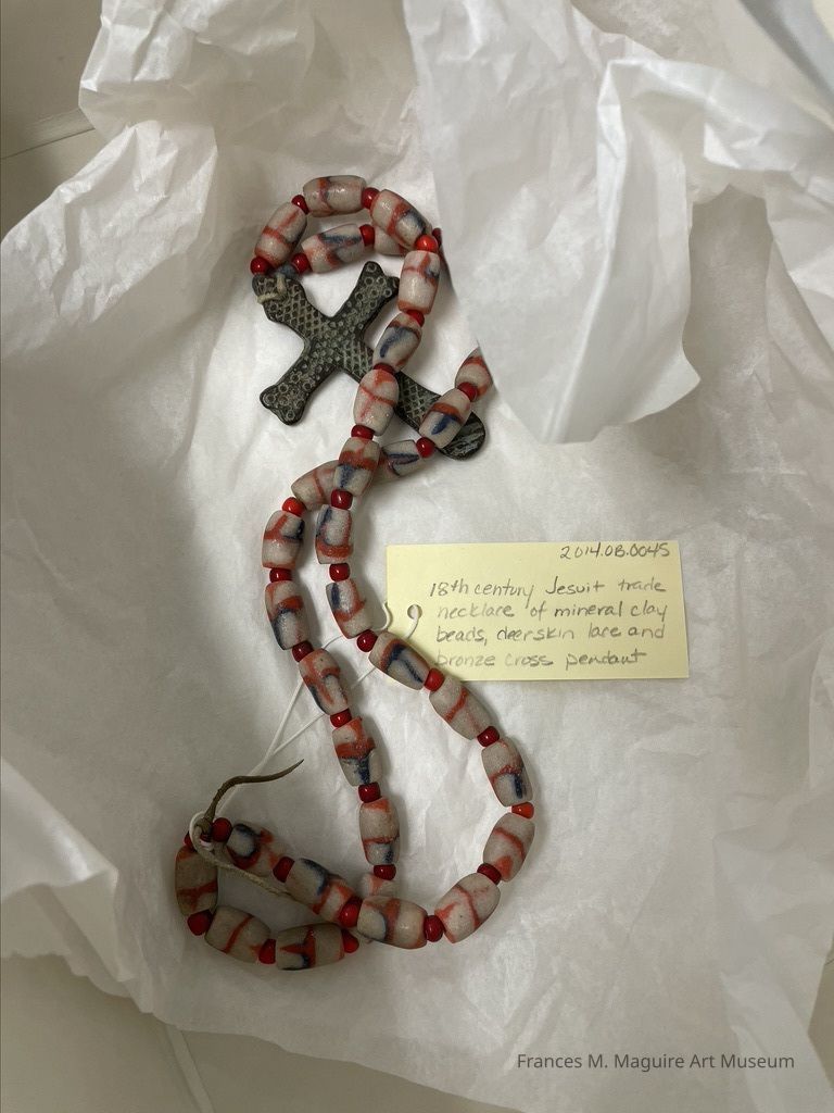 Shaped mineral “trade” beads with bronze cross strung on deerskin lace. Purchased through Fr. Joseph Lea.