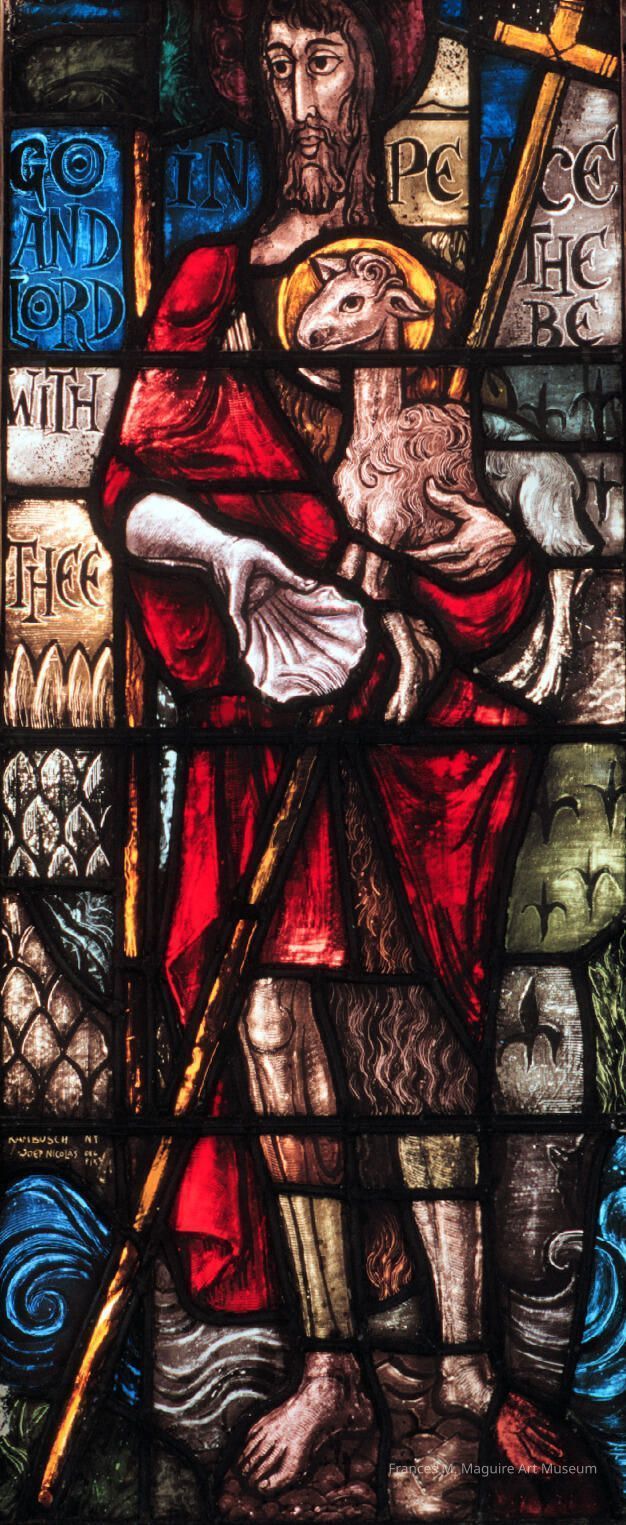 Stained-glass of John the Baptist holding the sacred lamb.