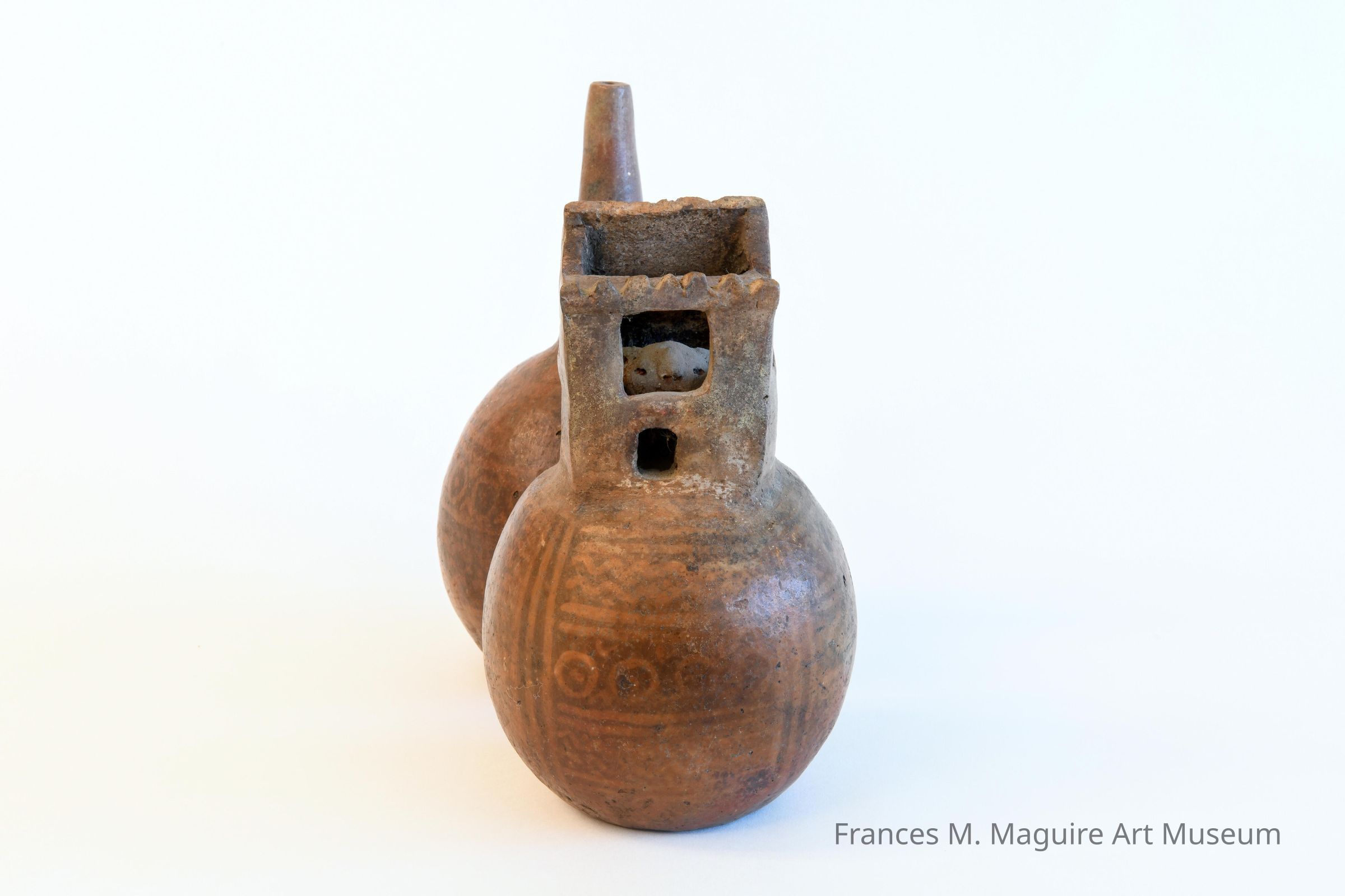 Lambayeque double-bodied vessel - one capped with a dwelling, the other with tall tapering neck, joined by a bridge handle.Made/Created