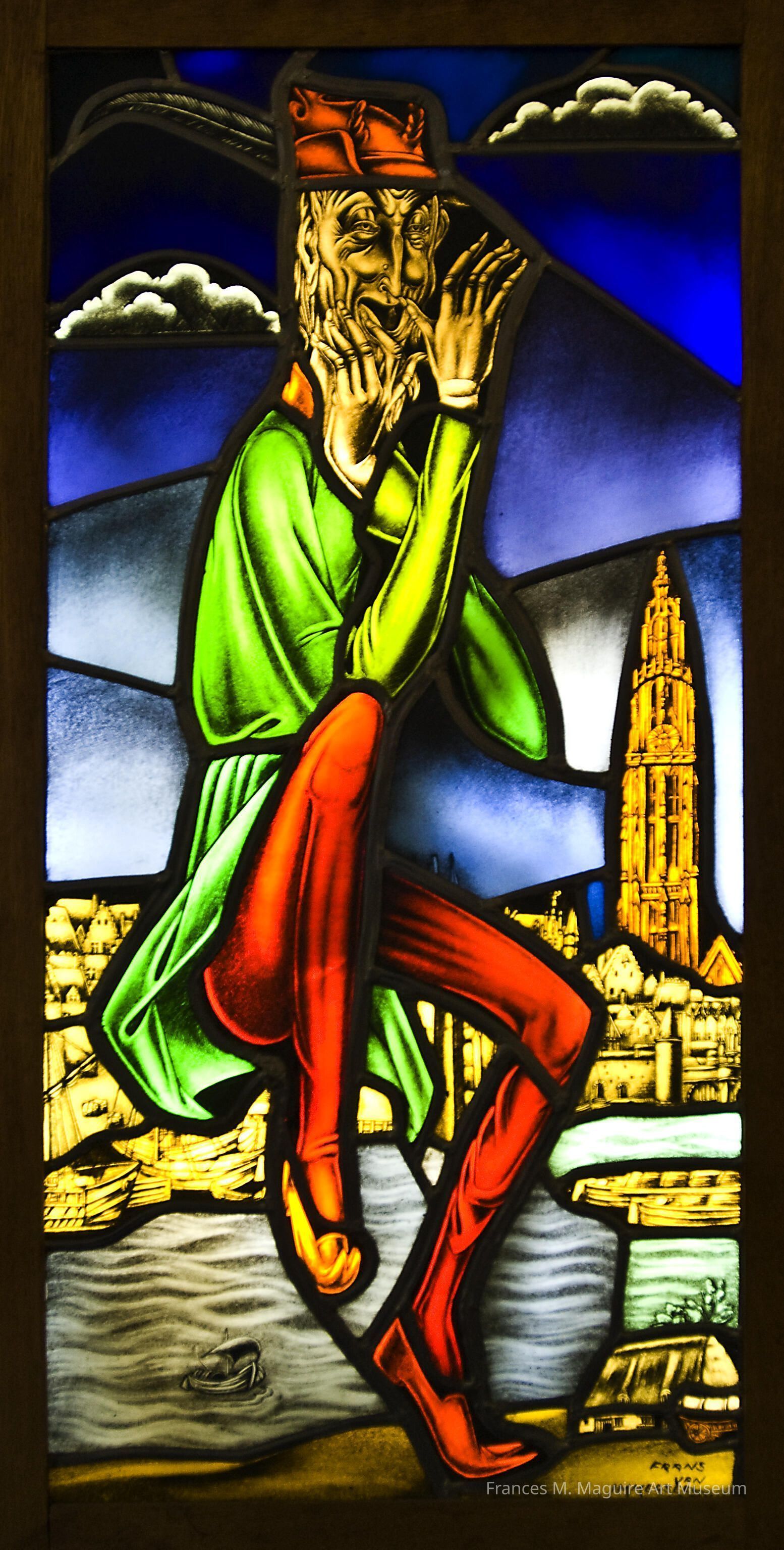 20th-c. stained glass panel of the Lange Wapper, a Flemish folkloric character.Made/Created