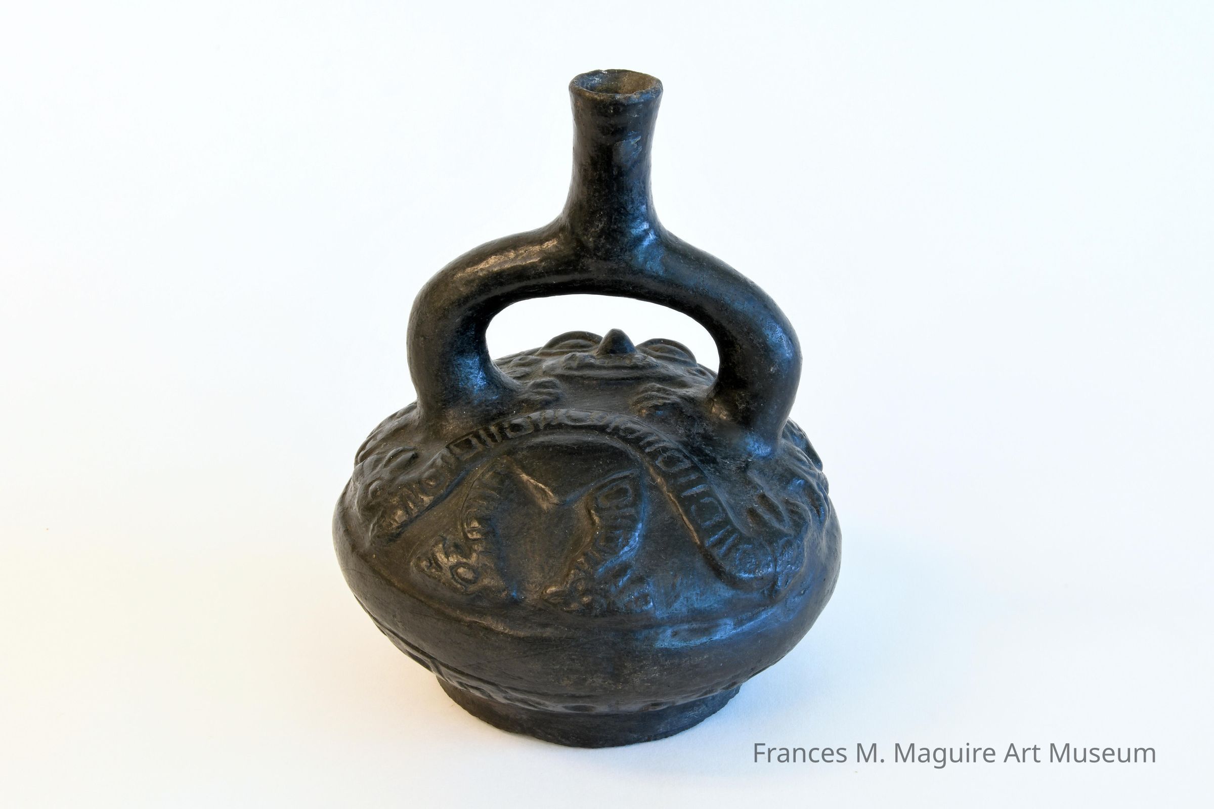 Late Chavin blackware relief molded stirrup vessel.