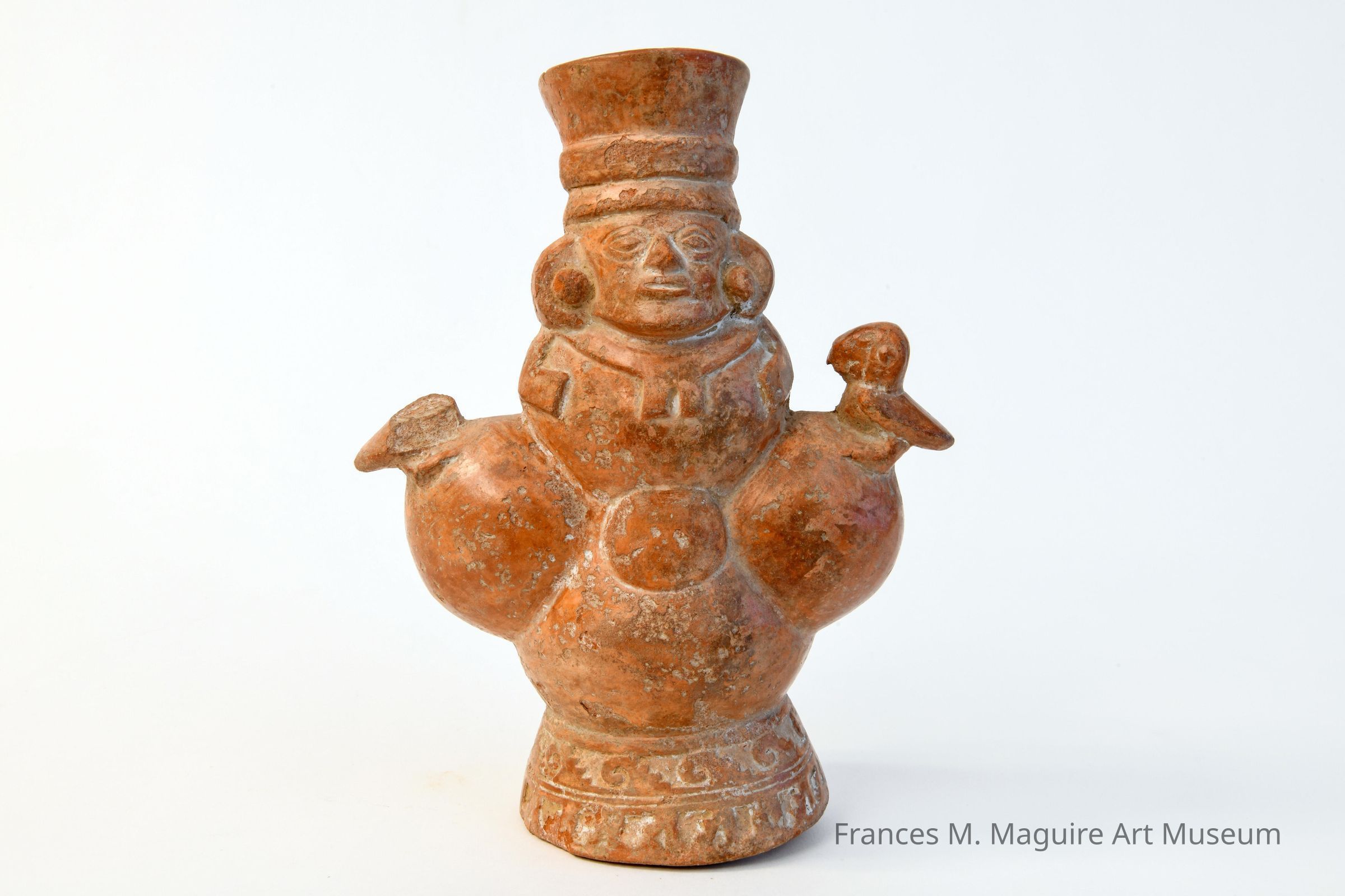 Late Mochica/Chimu molded pottery vessel in the form of a warrior framed by avian topped bulbs on left & right sides on incised ring foot in red clay.Made/Created
