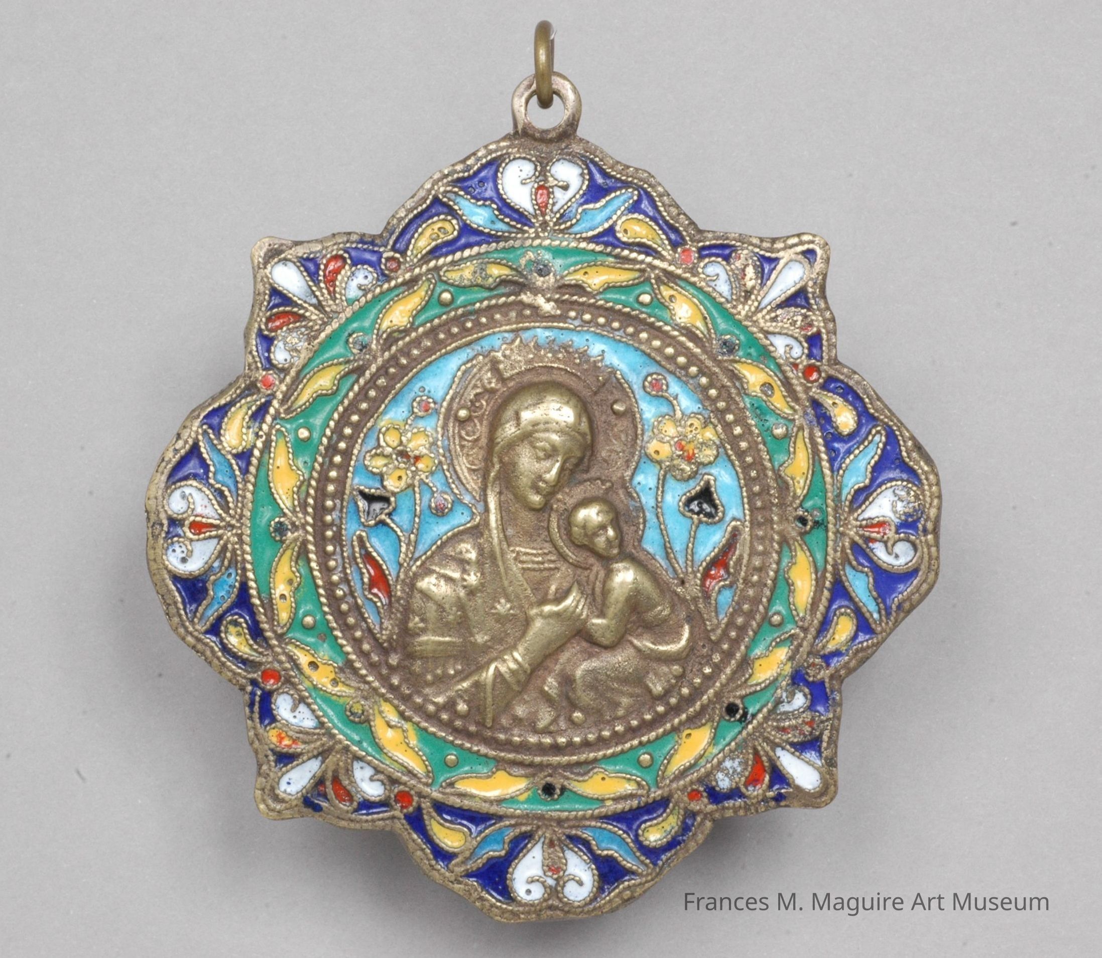 The brass-enameled pendant contains a central roundel depicting the Madonna holding the Christ Child on a sky blue background surrounded by flowers. Ornate and colorful patterns decorate the rest of the pendant.Interpretative Labels