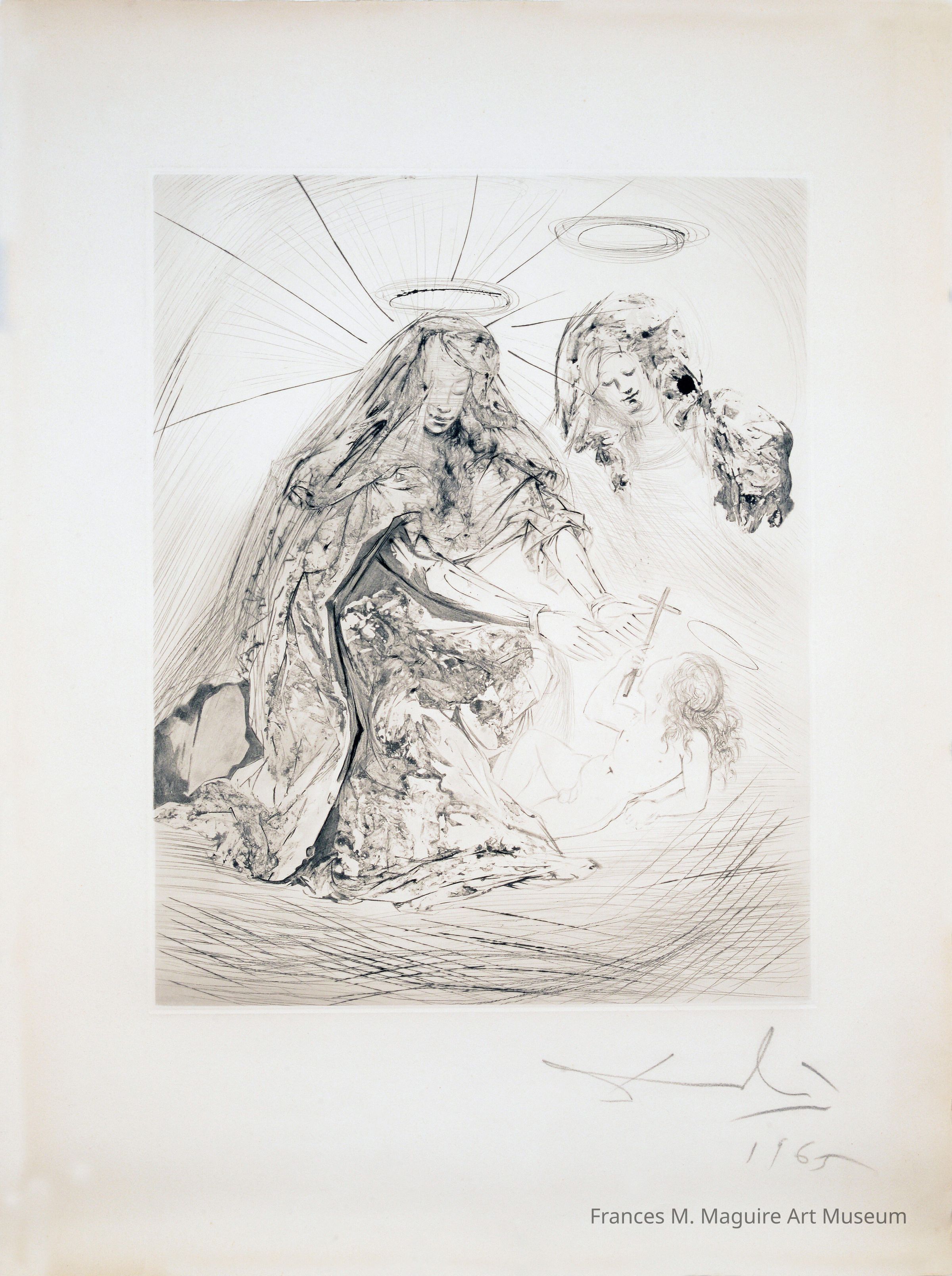 From his beginnings to his final years, Dalí produced work that abounds in references to the Renaissance, which allowed him to proclaim both the importance of the great tradition and his own worth as an artist. In the decades following World War II, Dalí especially embraced Renaissance themes and classicism. His depiction of Mary and her cousin Elizabeth with the Christ Child recalls 16th-c. renditions of the subject by artists such as Raphael and Leonardo da Vinci. The print exemplifies Dalí’s spirituality during this period, when he explored the intersections of religion, art, and science, which he called “Nuclear Mysticism.” The emphasis on the Christ Child also symbolizes Dalí’s artistic reawakening and break with Surrealism.
