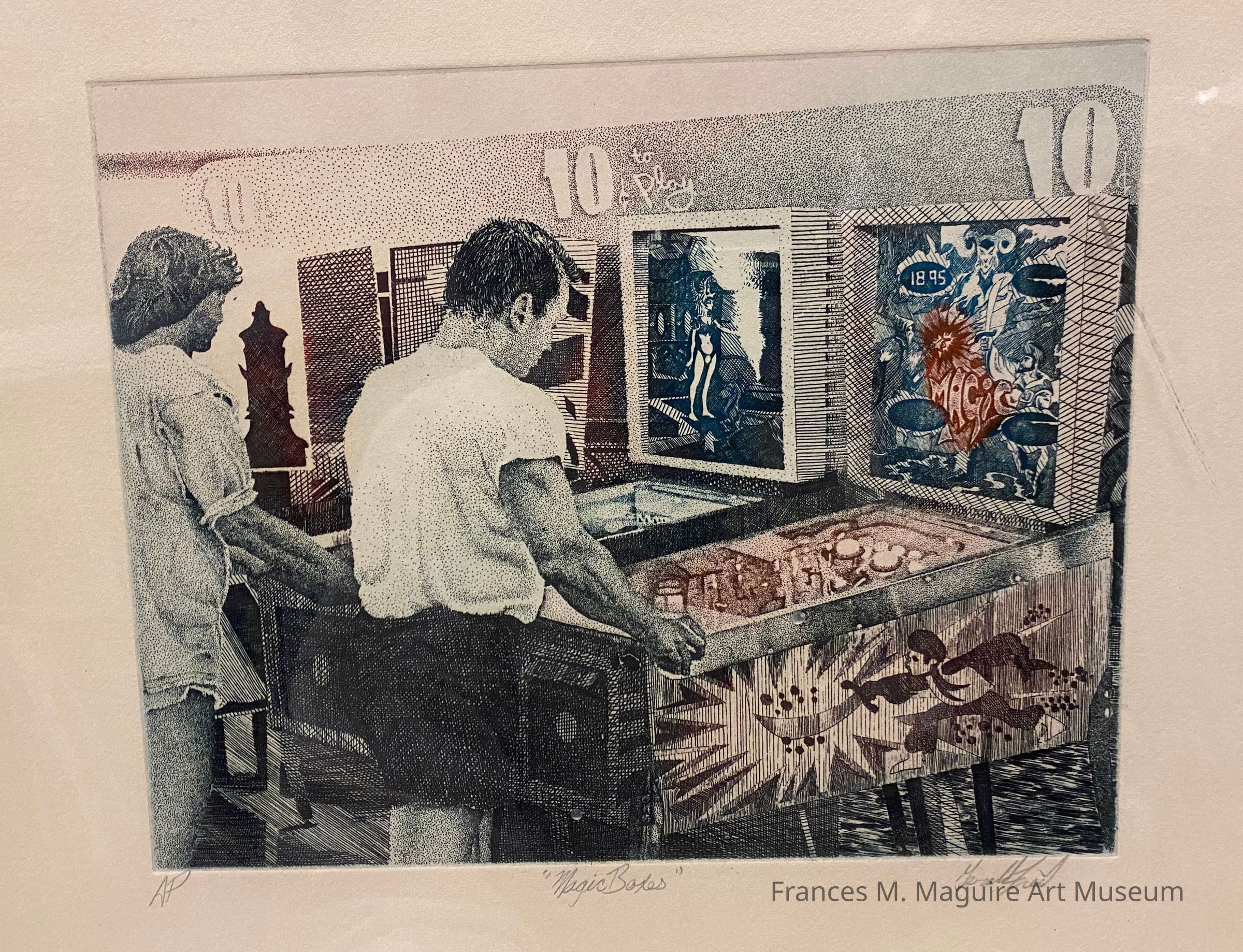Etching in colors of two young men playing pinball machines