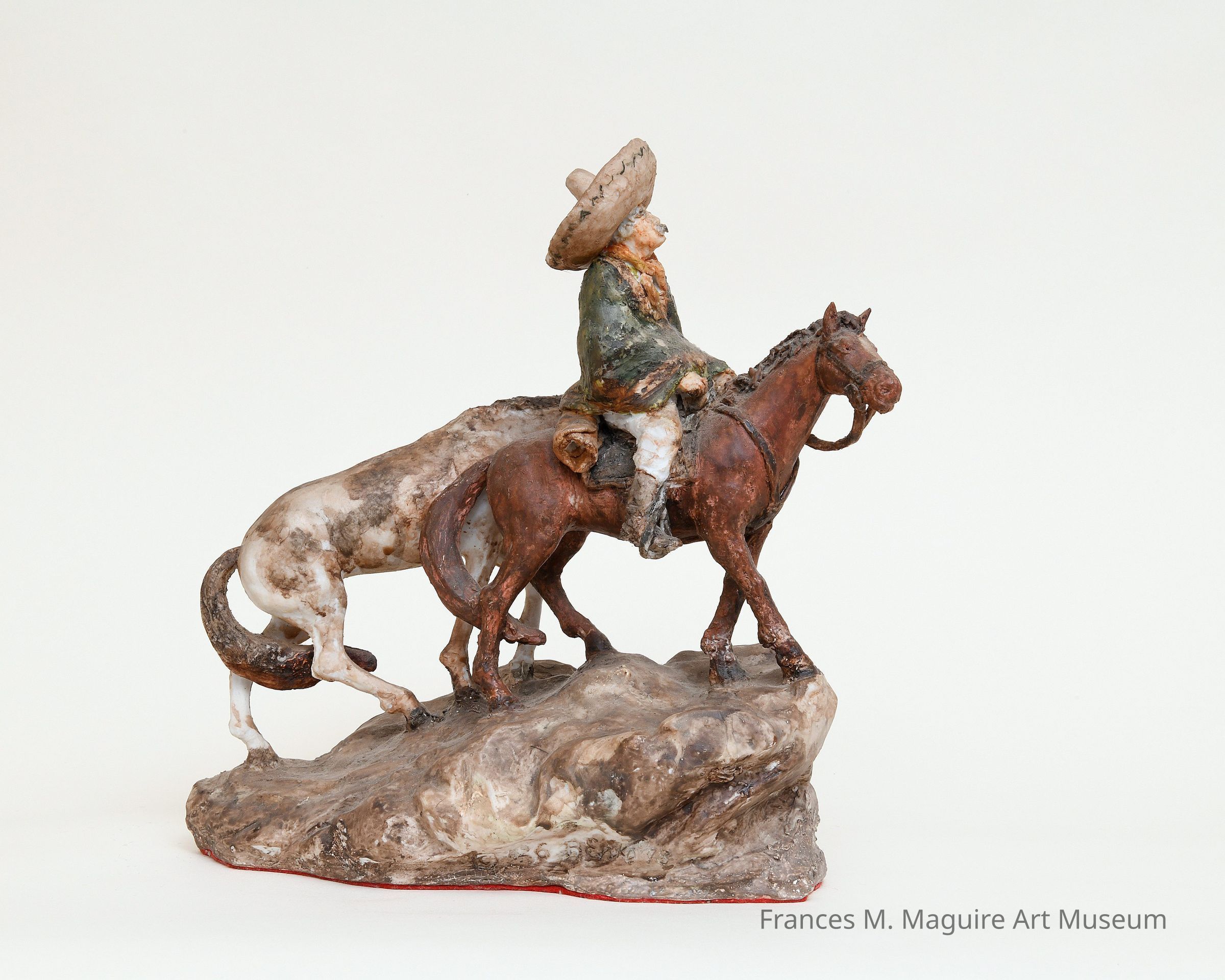 Colored porcelain sculpture of a man on horseback leading another horse.