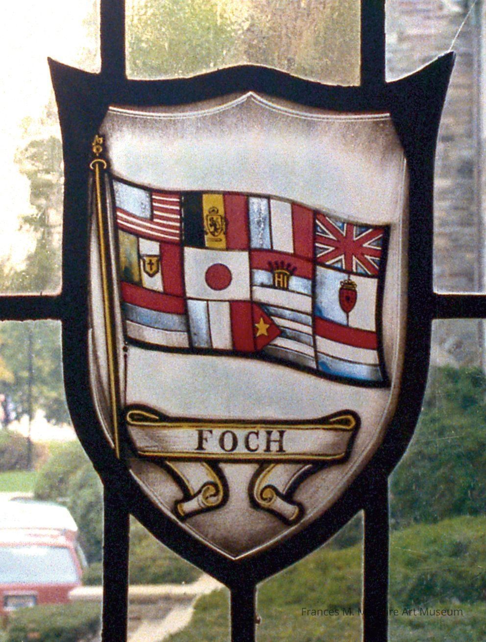 Stained-glass shield commemorating Marshall Ferdinand Foch (1851-1929), a French General, Marshall of France, and Allied Supreme Commander in WWI.Made/Created