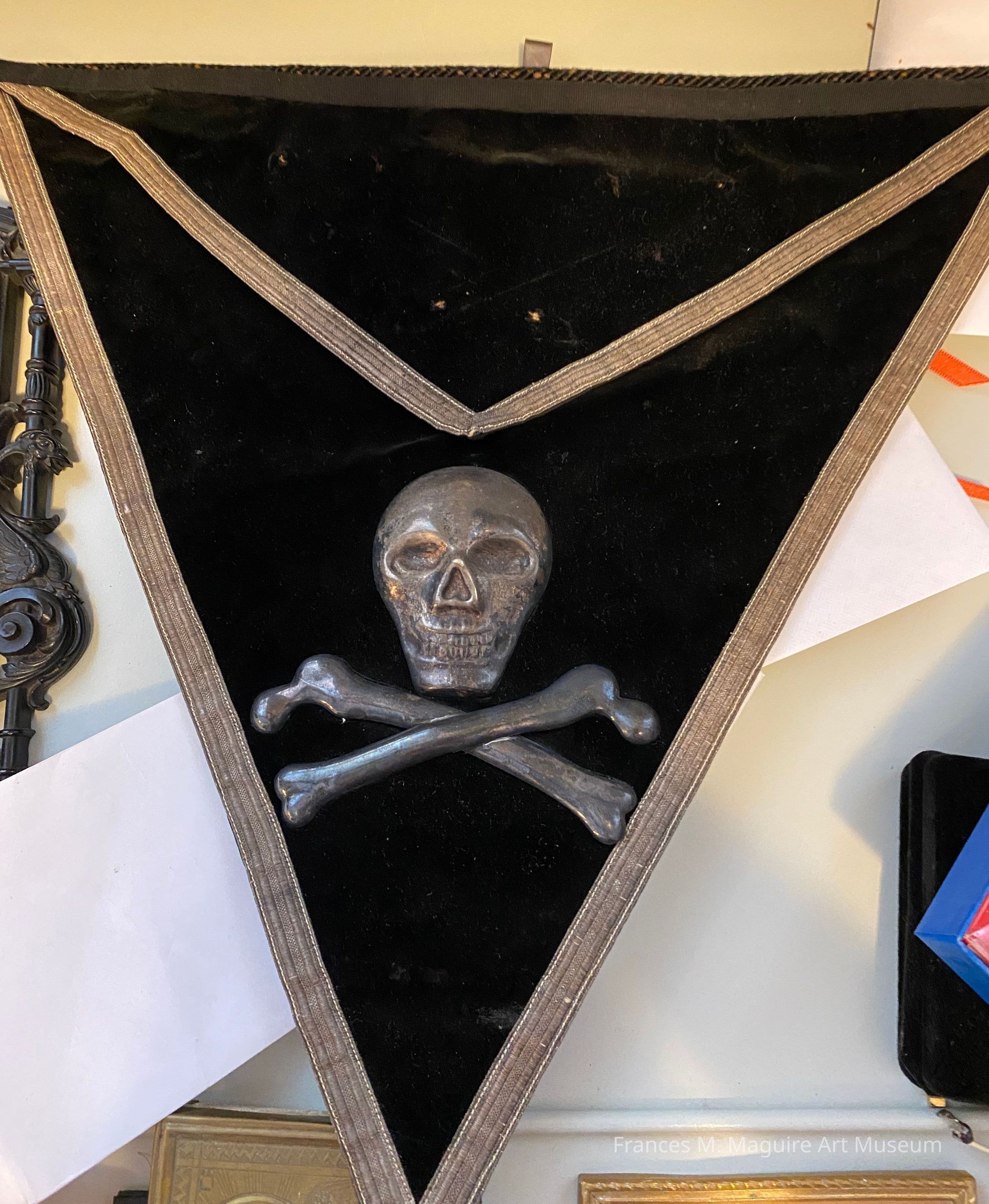 Masonic apron with a skull and cross bones emblem. The apron is made of black velvet and has silver bullion edging and silver mountings.