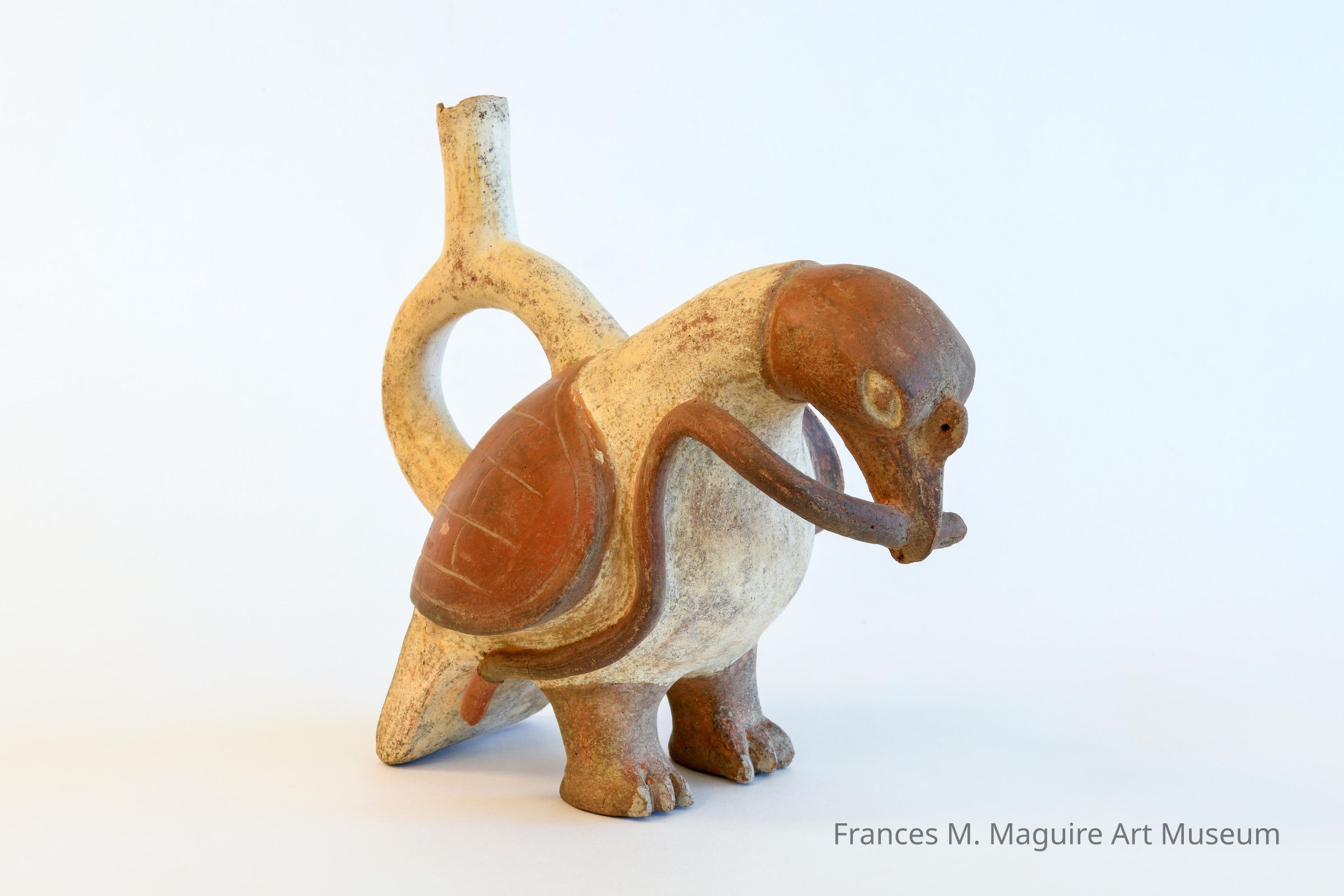 Middle Mochica mold made pottery vessel in avian form modeled eating a snake, stirrup spout.Made/Created