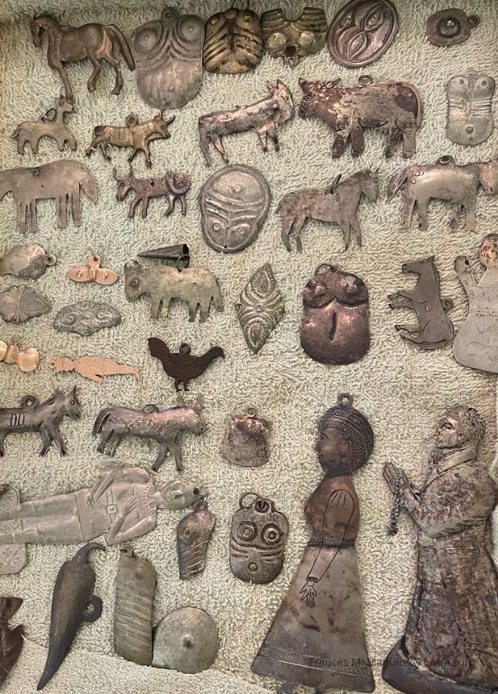 Box of 39 Mexican Milagros. Hammered tin and 3 gold Milagros.