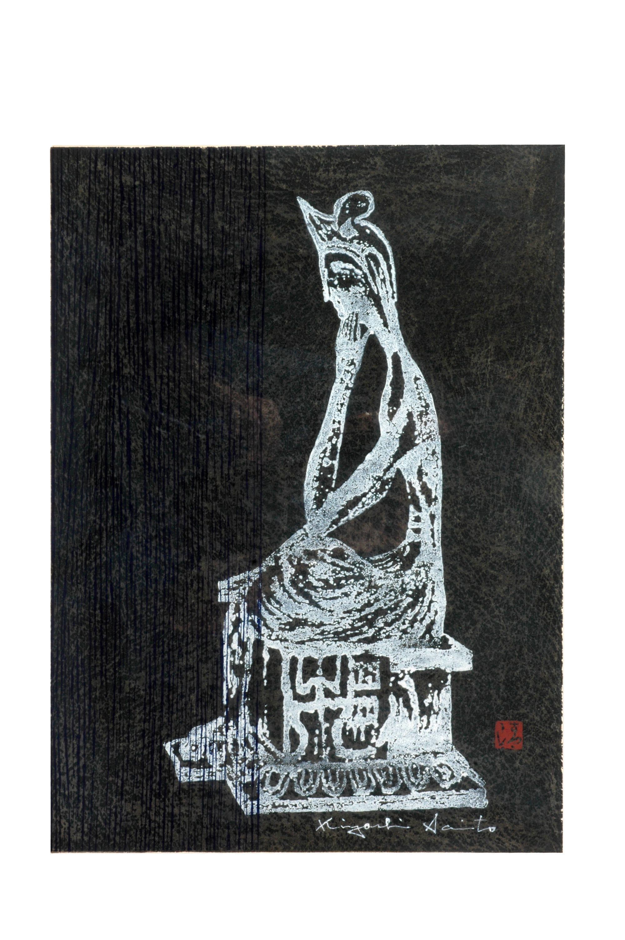 Buddhist themes are prominent throughout Saitō’s work, possibly because of the time he spent living at a temple in his youth. The subject of this print is Maitreya, the Buddha of the Future, known in Japanese Buddhism as Miroku. Miroku is a bodhisattva, a spirit waiting to begin his final human life cycle, and when he does arrive on Earth, he will establish a new age in Buddhism. Miroku is often portrayed in the “pensive” position, with one leg crossed over the other and a hand near the face. His legs represent his place in between worlds. Saitō famously fell into a slump in the ‘60s, where he experimented with different printing techniques and questioned his artistic vision. Perhaps here Saitō feels connected to Miroku, as they both wait to complete their journey.Label Type