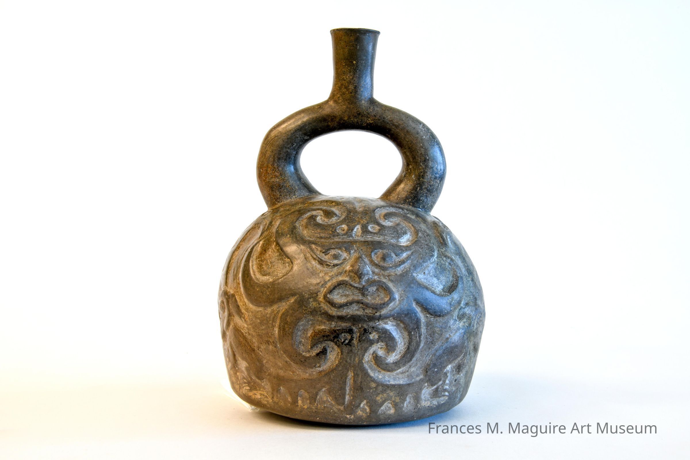 Mochica IV mold made stirrup vessel low relief decorated with a God’s head and deity smoke.Made/Created