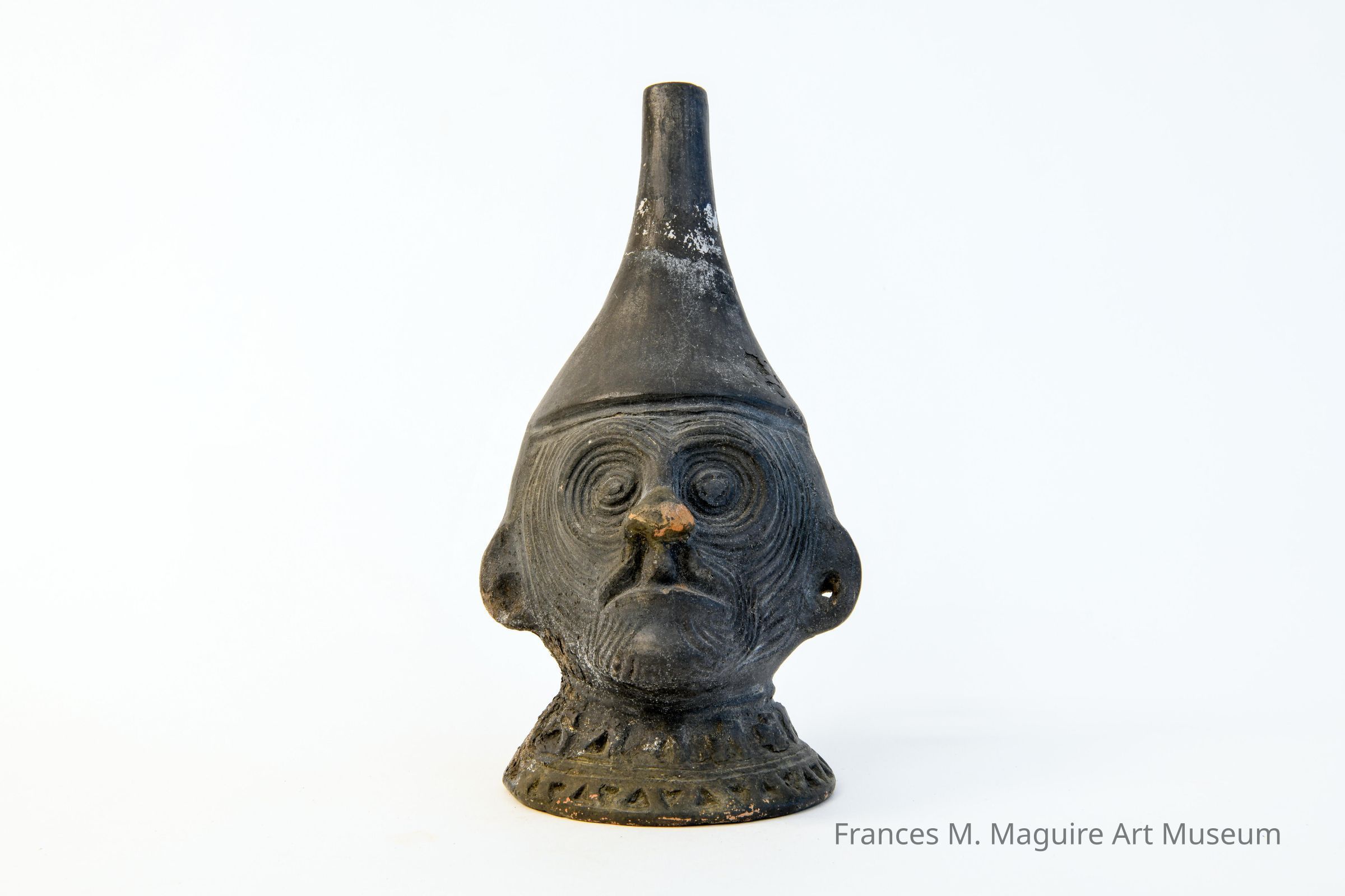 Mochica IV Molded Blackware Head Form Vessel with deeply furrowed face capped by an 'oil can' form spoutMade/Created