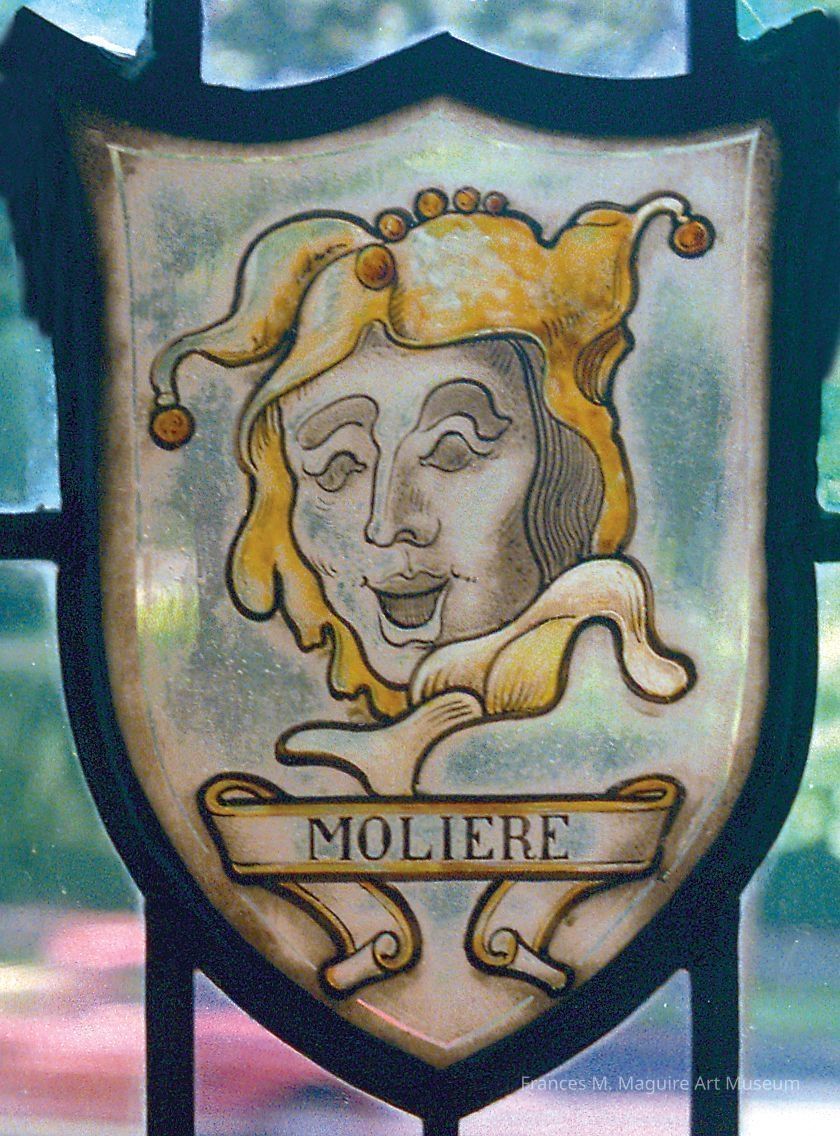 Stained-glass shield commemorating Moliere (1622-1673), a French comic playwright.