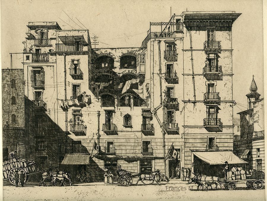 20th-c. drypoint etching of a building in Naples, Italy.