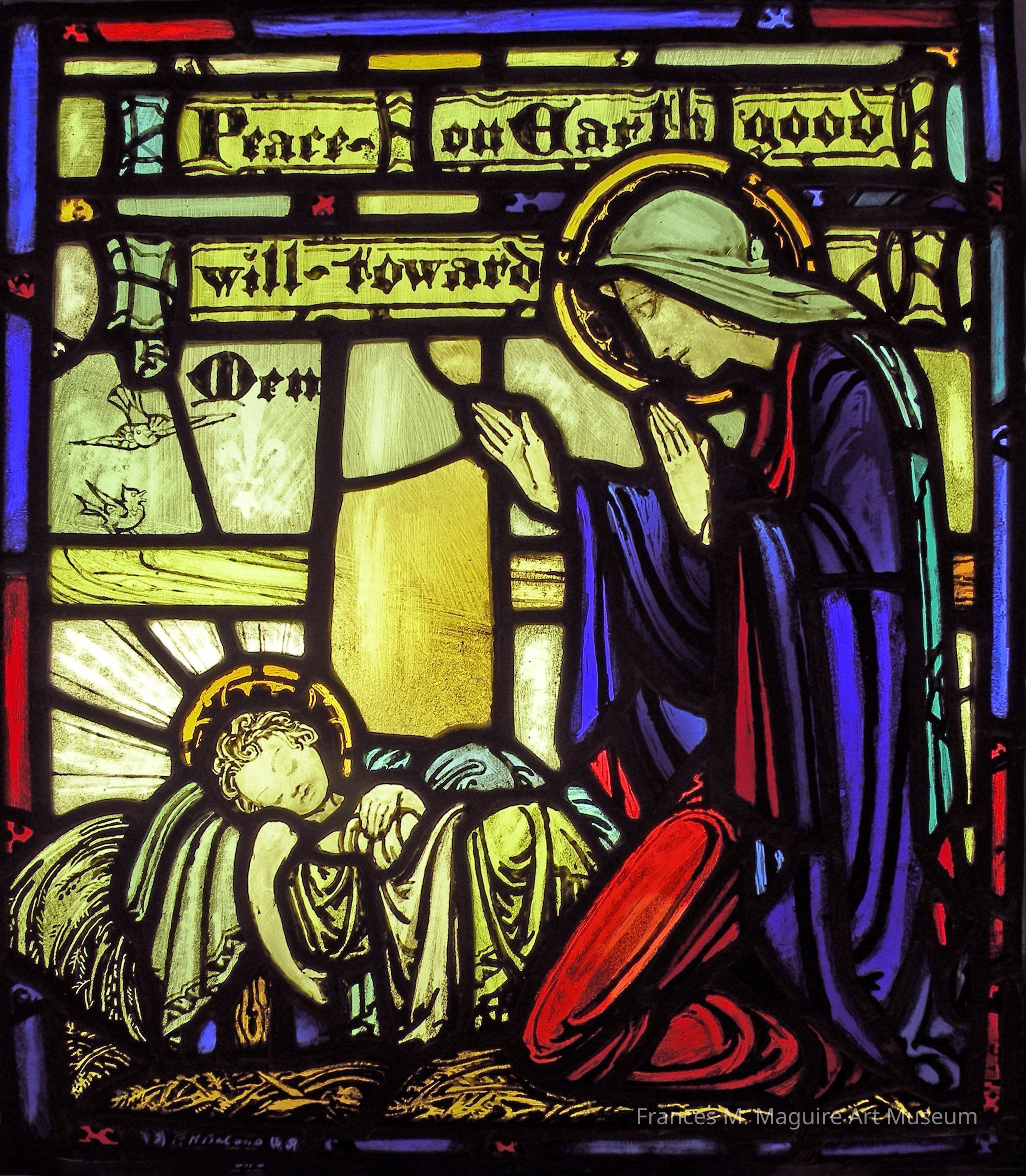 20th-c. stained-glass window of Mary praying over the Christ Child, who is sleeping in the manger. The text at the top of the window reads, "Peace on Earth, good will toward men."Artwork Details