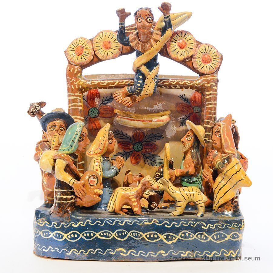 20th-c. Mexican folk art sculpture depicting a Nativity scene with Mary, Joseph, Baby Jesus, an angel, 2 visitors, and animals.Interpretative Labels