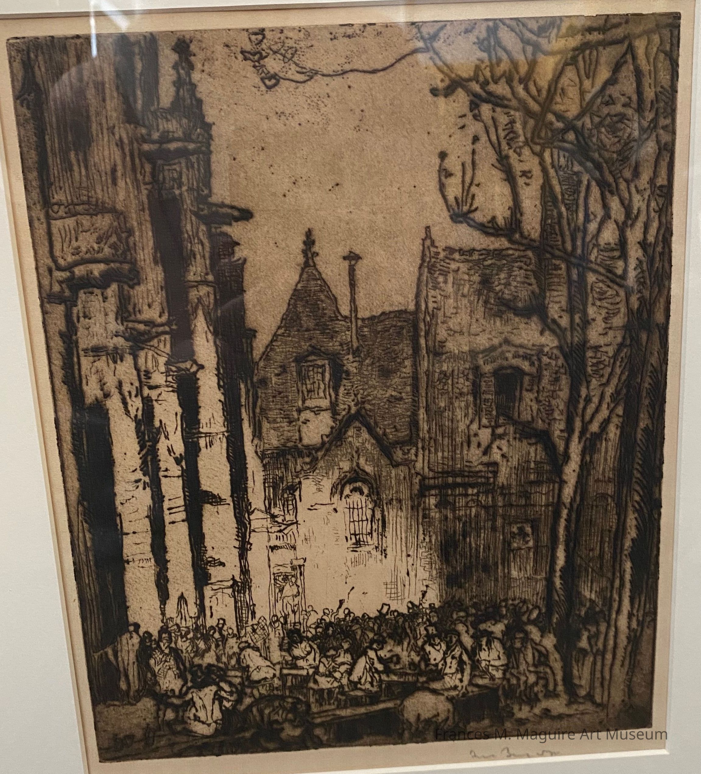 20th-c. black-and-white drypoint print of the church, Notre-Dame-la-Riche, in Tours, France.