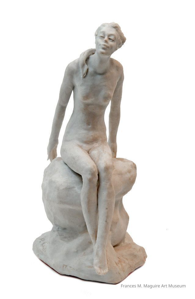 Porcelain sculpture depicting a nude woman sitting on a rock.Made/Created