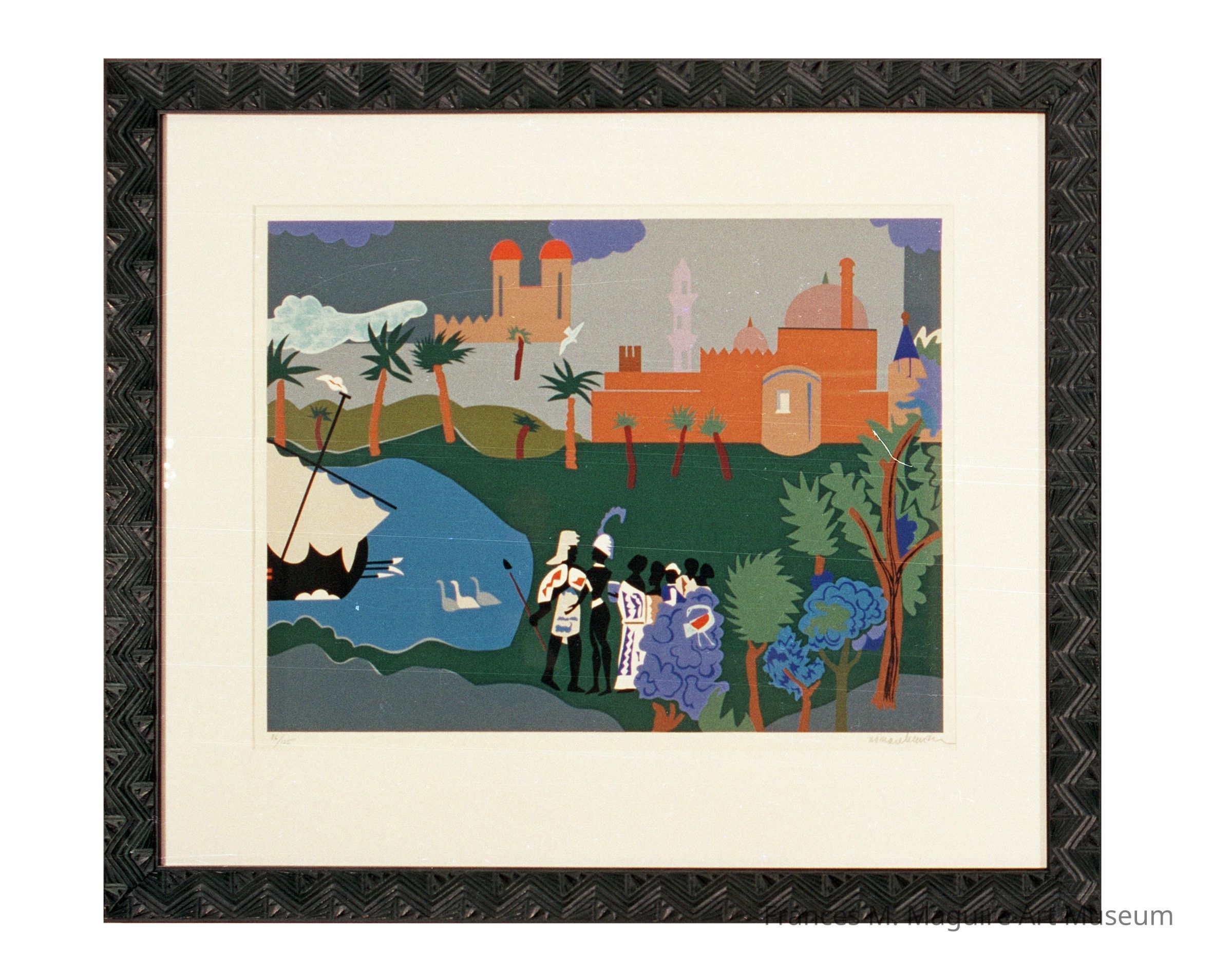 Bearden is especially known for his complex, layered collages that he enlarged using a photostatic process. He often depicted themes derived from his personal memories, literature, history, the Bible, and music. Circe Turns a Companion into a Swine and Odysseus Leaves Nausicaa form part of a series of 20 colorful serigraph (a type of silkscreen) prints based on the Odyssey—the Homeric poem recounting the Greek hero Odysseus’s journey home after the Trojan War. Bearden reimagined the ancient Greek narrative as a Black epic set in Africa. He thus correlated Odysseus’s long and difficult trek to African Americans’ experiences, while also highlighting the Odyssey’s universal relevance. The prints reproduce an eponymous series of collages Bearden made in 1977 using color-aid paper.