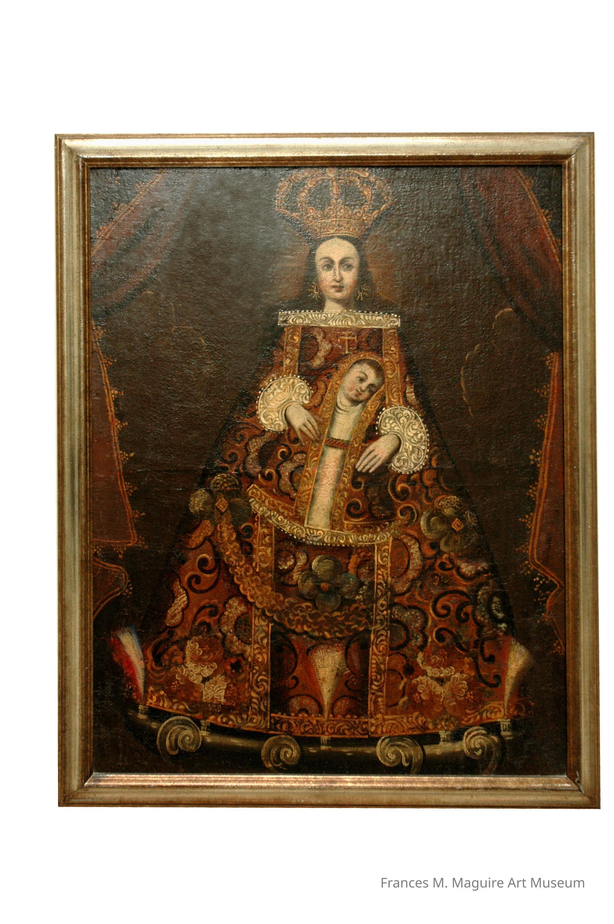 This Marian (related to the Virgin Mary) painting depicts the dressed statue of Our Lady of Bethlehem, patroness of Cusco and protectress from natural disasters. The statue is one of the city’s most venerated Christian sculptures believed to perform miracles unique to an Andean context. She also is carried in procession during the Feast of Corpus Christi, which celebrates the Holy Eucharist. Standing on a pedestal adorned with feathers, Our Lady of Bethlehem wears an imperial crown and a sumptuous, brocaded gown decorated with native flowers. The Christ Child emerges stiffly from her garments. Her triangular shape may dually signify the Holy Trinity and the Andes mountains, where local pagan deities were worshiped. The picture is embellished with brocateado, gold embroidery characteristic of the Cusco School.