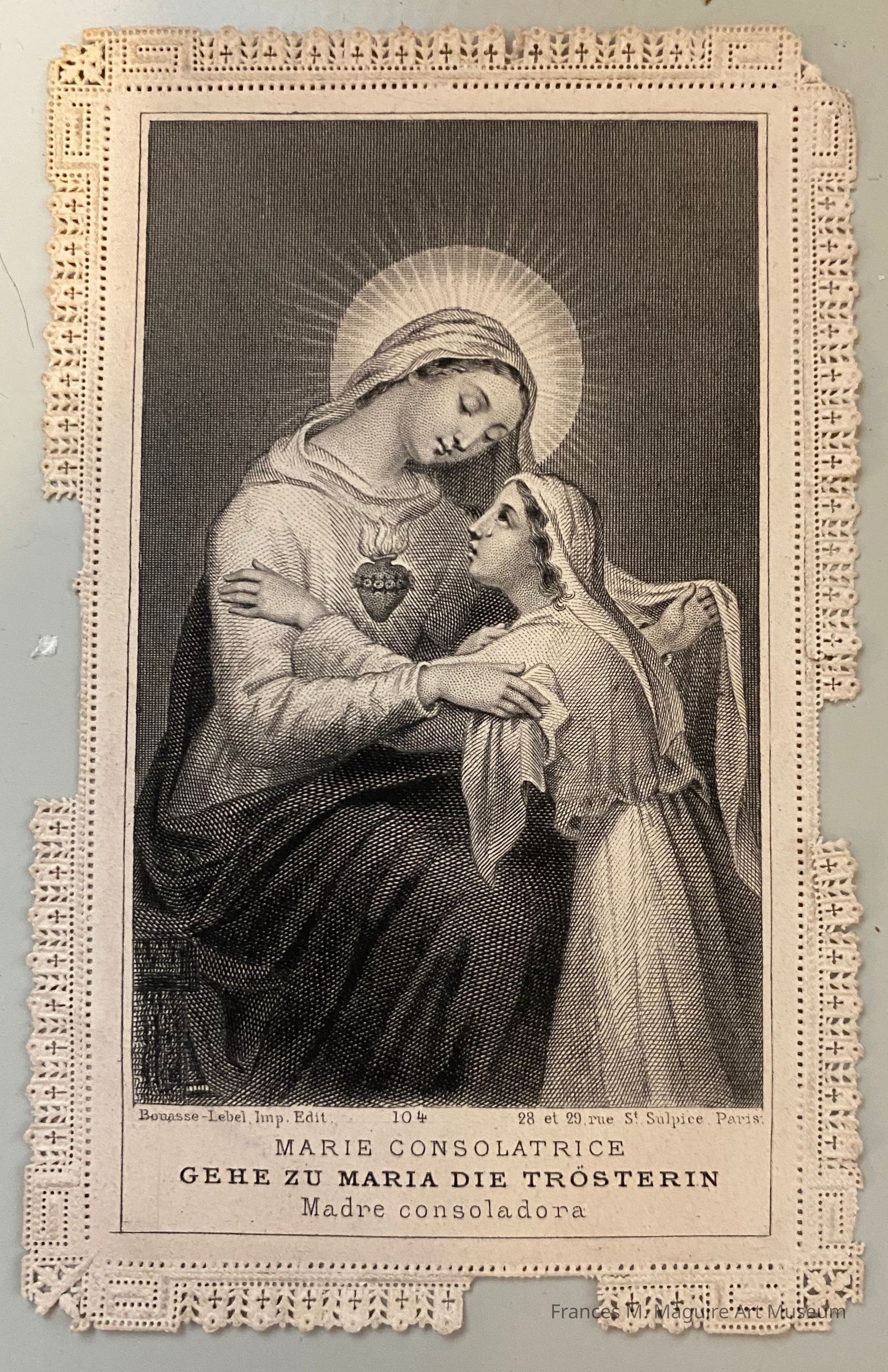 French holy card with a print of Marie Consolatrice or Our Lady of Consolation. The card has paper lace edges.