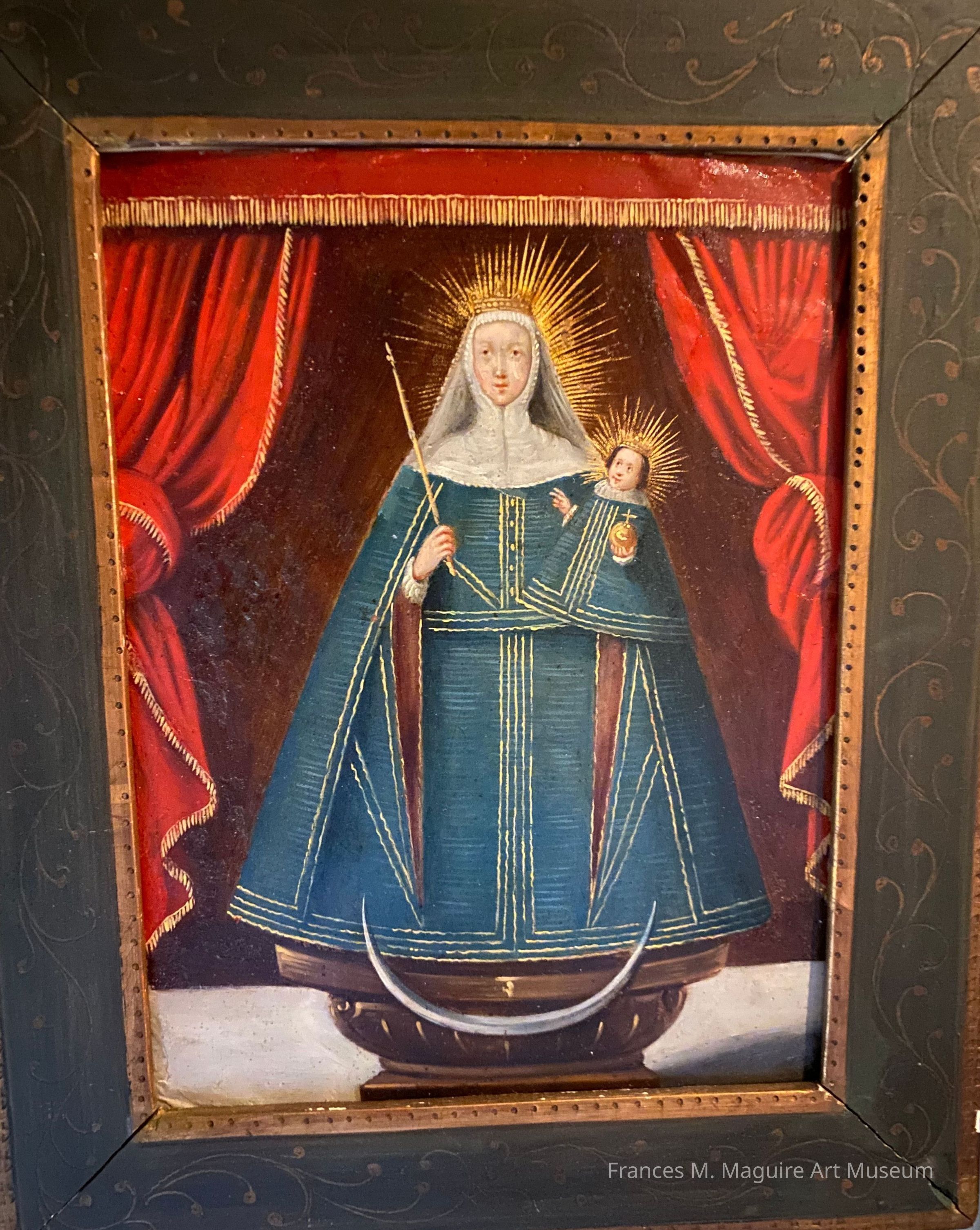 Mexican retablo painting of Our Lady of Solitude holding the Christ Child.