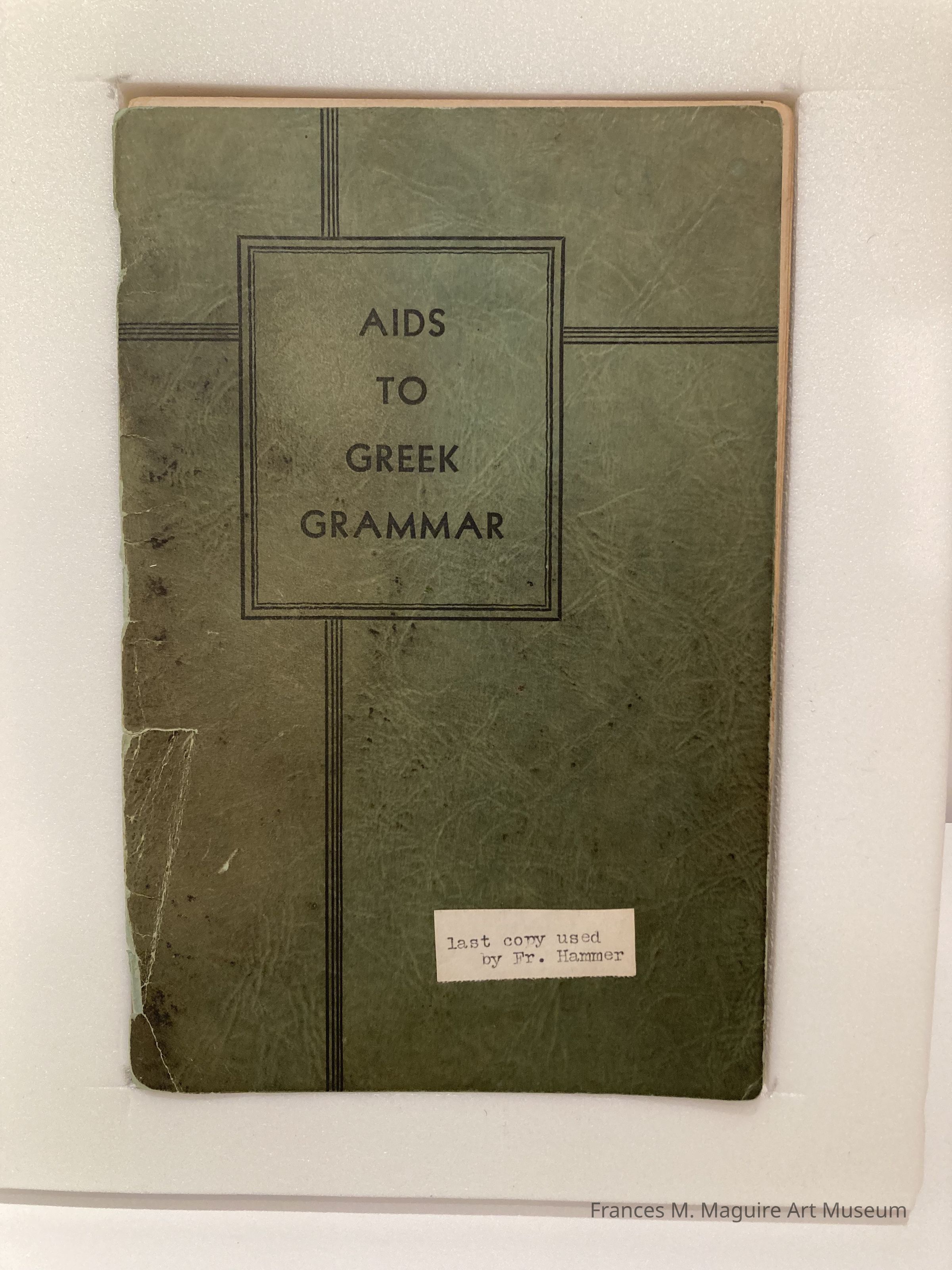 Book titled "Aids to Greek Grammar," written by Fr. Dominic E. Hammer, S.J. and published by the Jesuit Novitiate at Wernersville, PA. A label on the front of the book indicates that this is the last copy used by Fr. Hammer.Dimensions