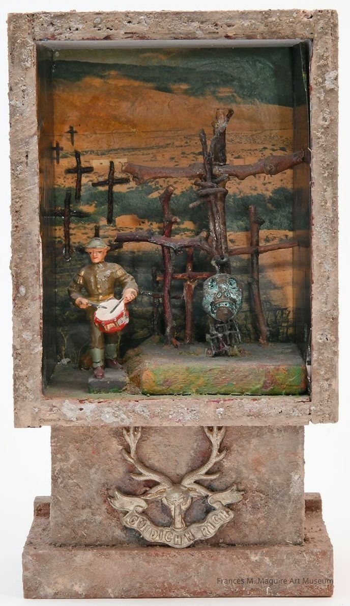 20th-c. mixed media box construction with a drumming Doughboy marching past rows of crosses made from twigs.Made/Created