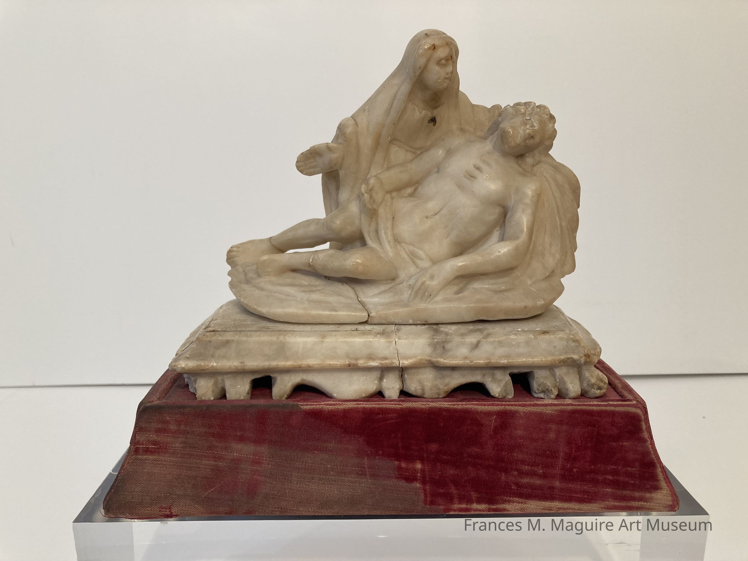 Ivory sculpture of the Pieta on a red velvet riser.