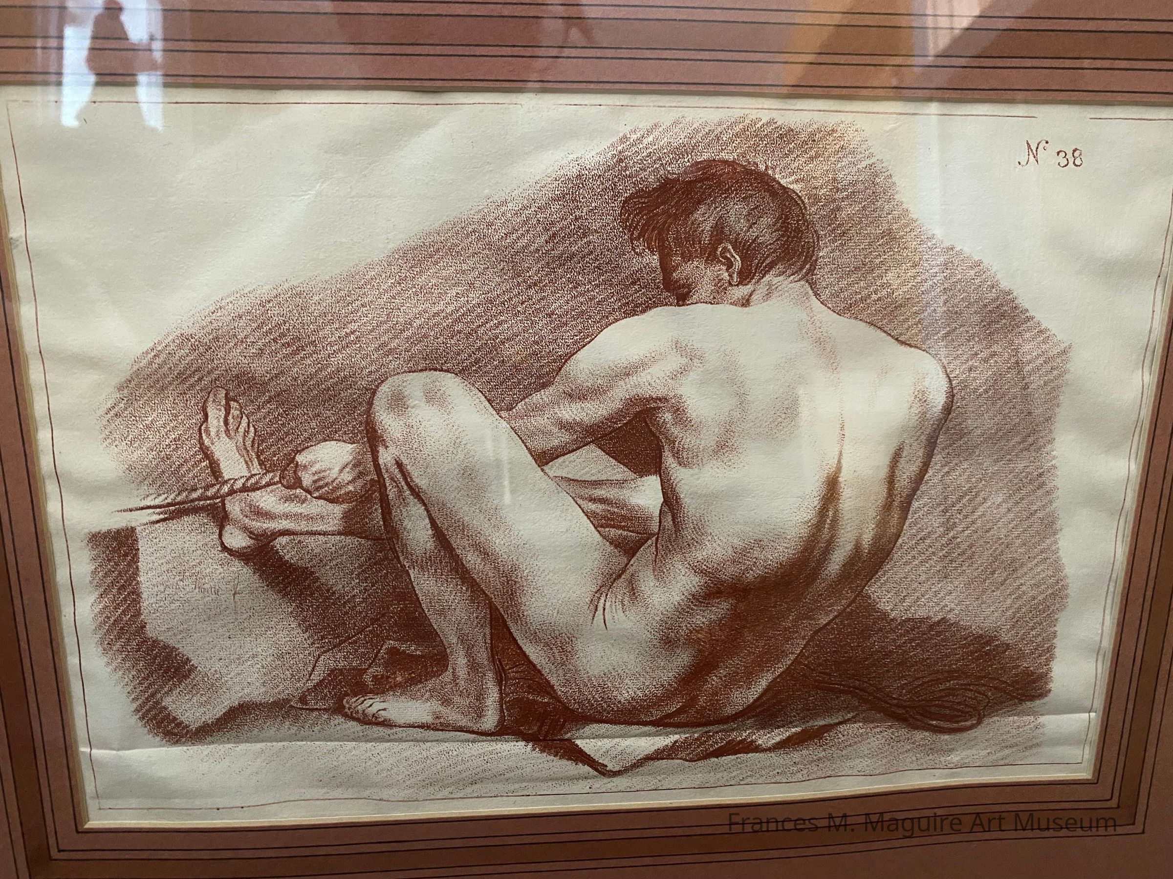 Reprint in color of an 18th-c. stipple engraving of a seated male nude figure viewed from behind pulling a rope.