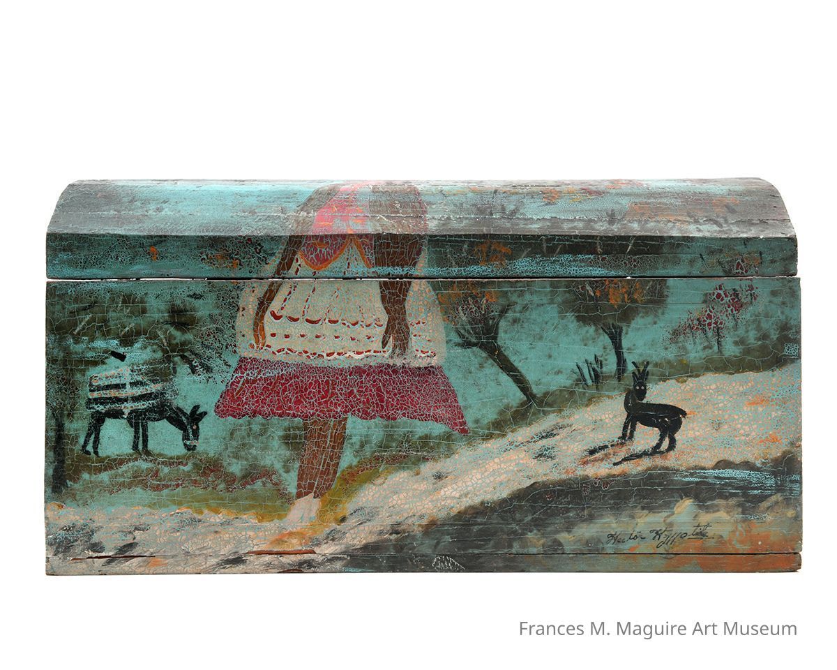 Mexican polychromed pinewood box with curved and hinged lid. It is decorated with the image of a peasant woman (spanning the lid and front of the box) in a rural landscape with a donkey and a deer. There are images on the side and back of houses and donkeys.Made/Created