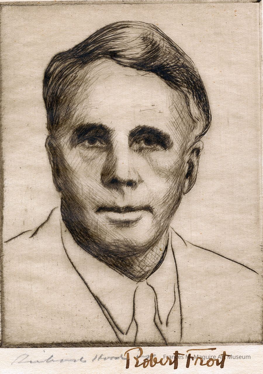20th-c. etching of Robert Frost, an American poet. This print is signed both by the artist and Robert Frost himself.