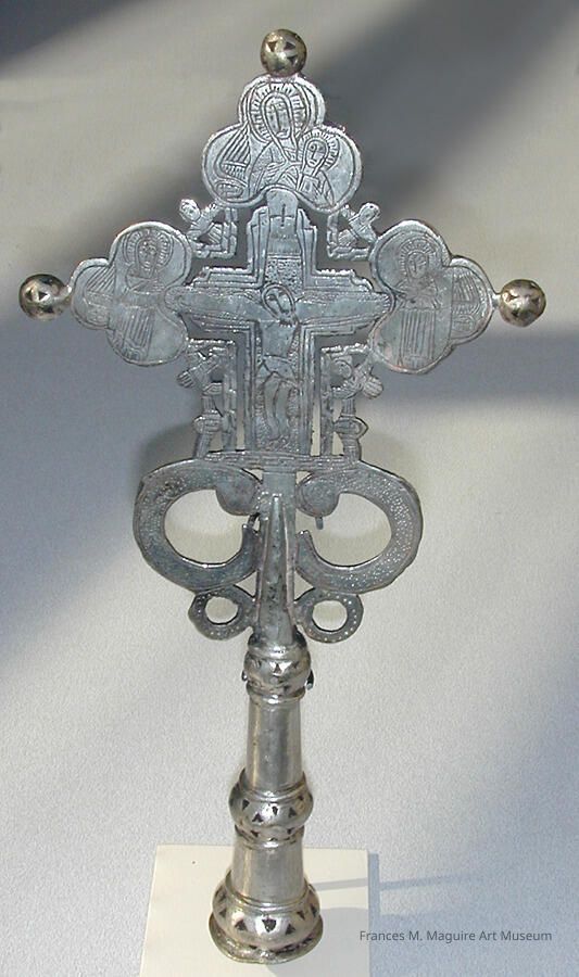 Dazzling crosses fit onto a pole are used in Ethiopia to lead processions. The loops below this cross–through which long strips of cloth and streamers are often woven–strengthen its connection to the shaft. The imagery depicts the crucified Christ flanked by Mary and John the Evangelist. A panel with the Mother and Child above the cross signifies the incarnation. Unique to this example are the angels turned sideways that appear in each of the side panels. The reverse portrays the Mother and Child, possibly the Old Testament prophet Isaiah, and angels.
