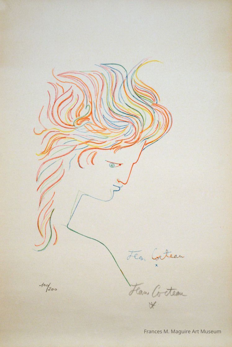 20th-c. untitled colored lithograph of a figure in profile, ed. 100/200, signed by Jean Cocteau.Made/Created