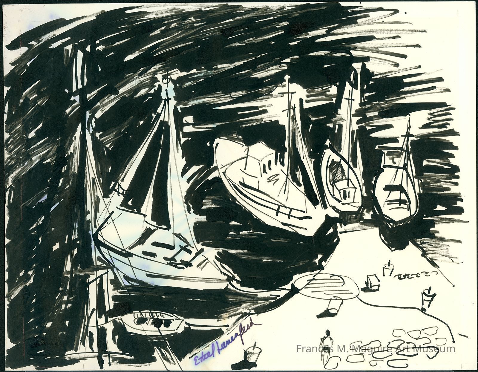 20th-c. black marker drawing of sailboats at a dock.Made/Created