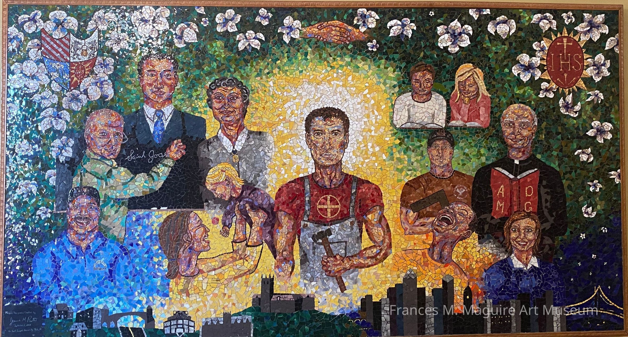 Mosaic of people at Saint Joseph's University. Along the lower edge, you can see iconic campus buildings as well as the Philadelphia skyline. This mosaic was commissioned by SJU's Human Resources Department.Made/Created