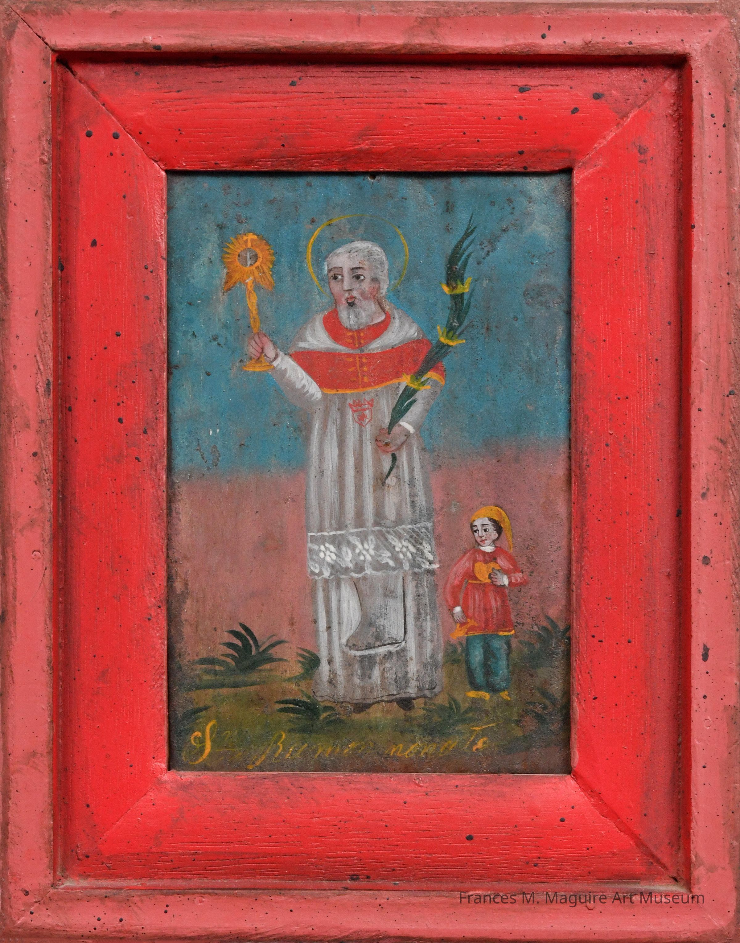 19th c. Mexican retablo of San Ramon Nonato in red painted frame.Made/Created