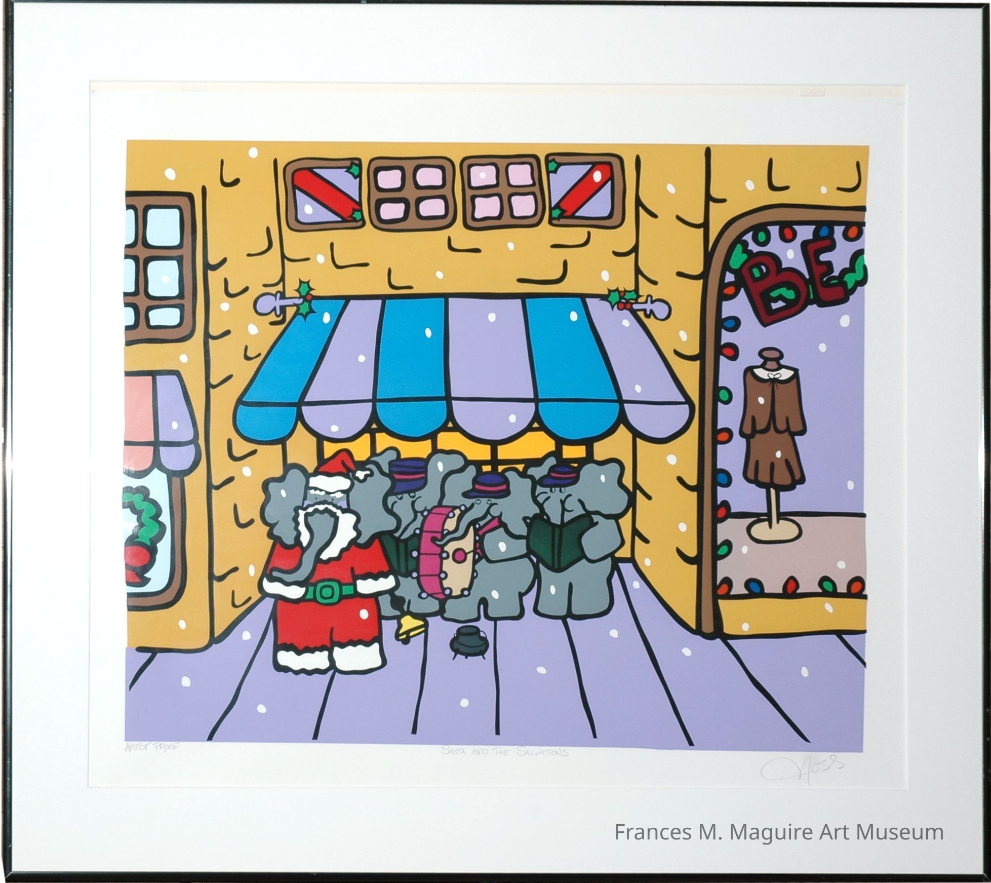 20th-c. color lithograph of a band of elephants busking outside of a store. One elephant is dressed as Santa.Made/Created